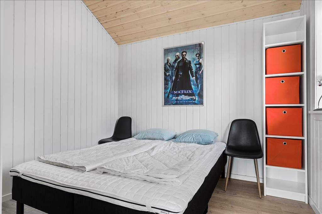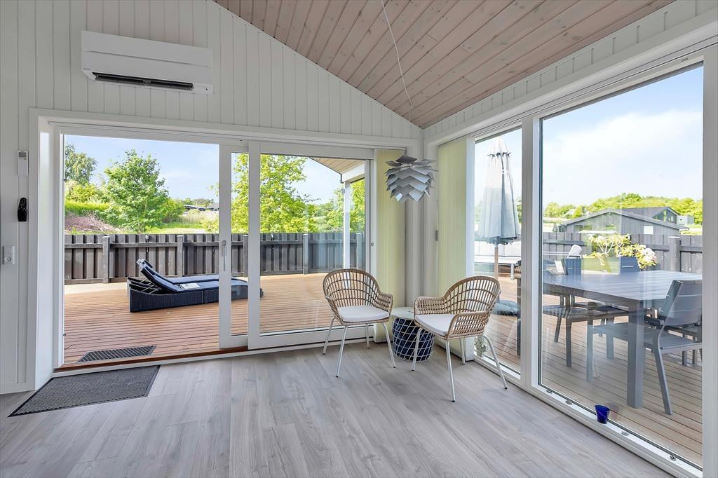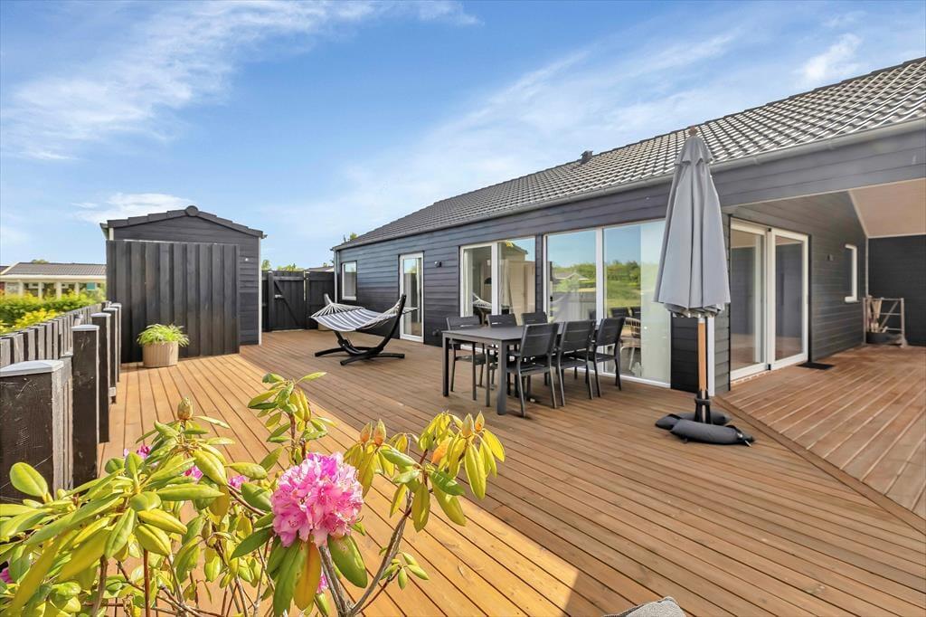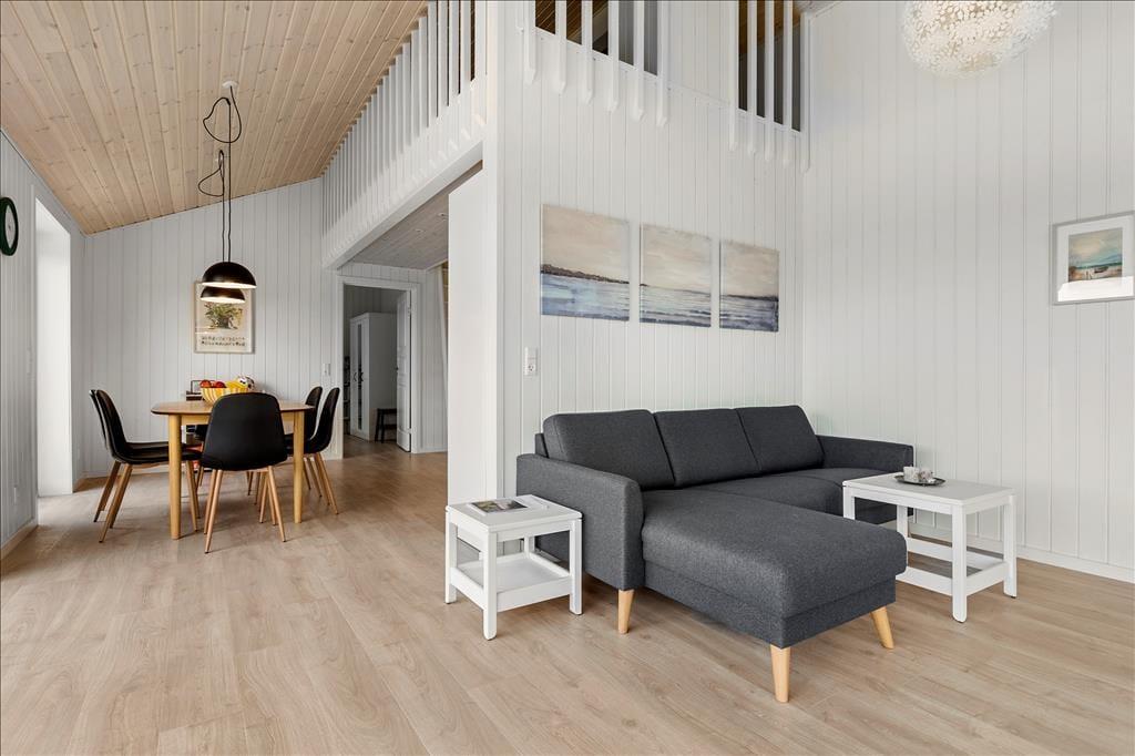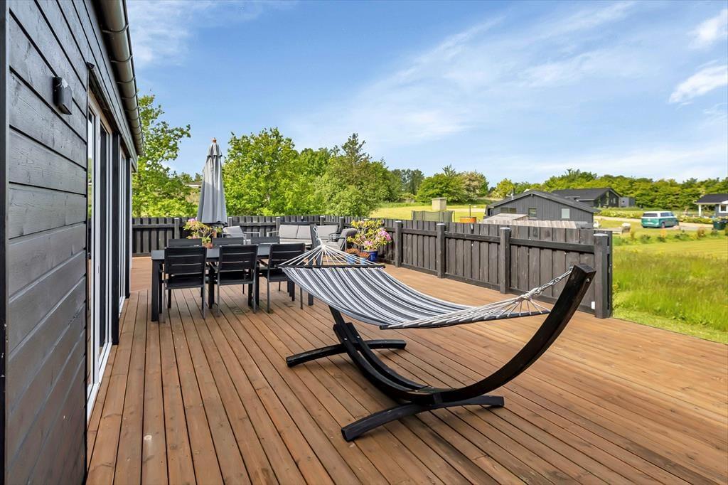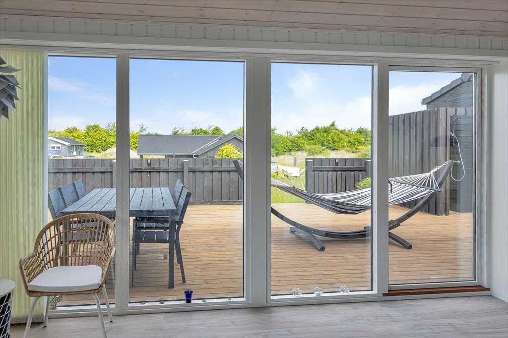 Huset er lyst og rummeligt og indeholder stue med store panoramavinduer, fjernsyn med chromecast samt varmepumpe. Køkkenet er åbent og indeholder opvaskemaskine og mikroovn. Spisepladsen indbyder til hyggelige stunder for hele familien. Grundet panoramavinduer i hele stue/køkkenområdet, er lysindfaldet perfekt. Der er 3 gode soveværelser, hvoraf det ene er med dobbeltseng på 150x200cm og de 2 med enkeltsenge, der kan sættes sammen til dobbeltsenge. Huset er omgivet af en kæmpestor og smuk træterrasse, som giver en naturlig forlængelse af stue og køkken og med meget plads til at boltre sig. Terrassen på over 100m2 er indhegnet og derfor oplagt til leg for børn. Terrassen indeholder også dejlig udebruser til varme dage efter strandbesøg eller leg. Grunden er naturgrund med shelter og bålsted.