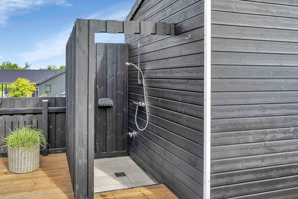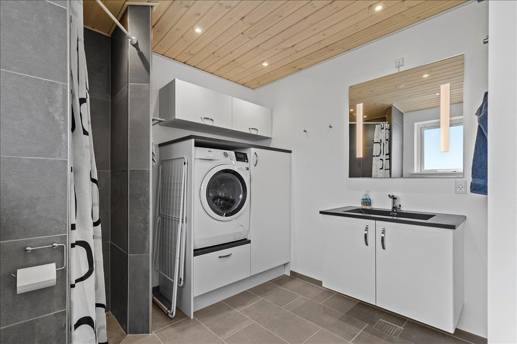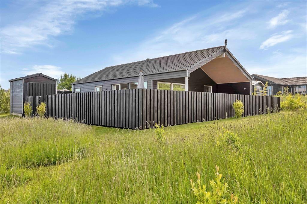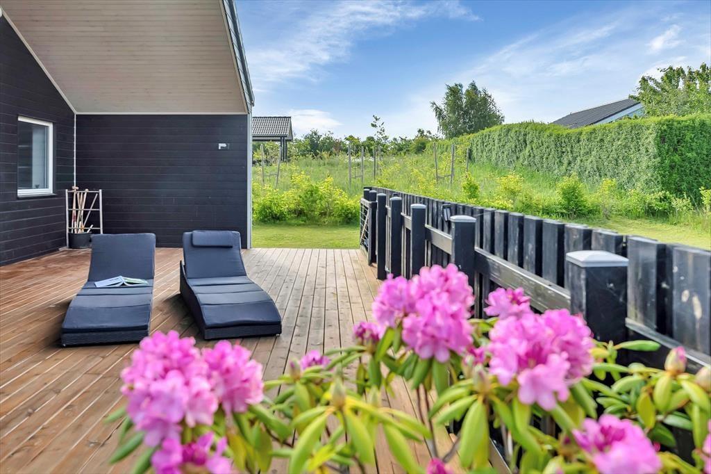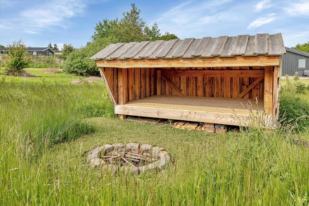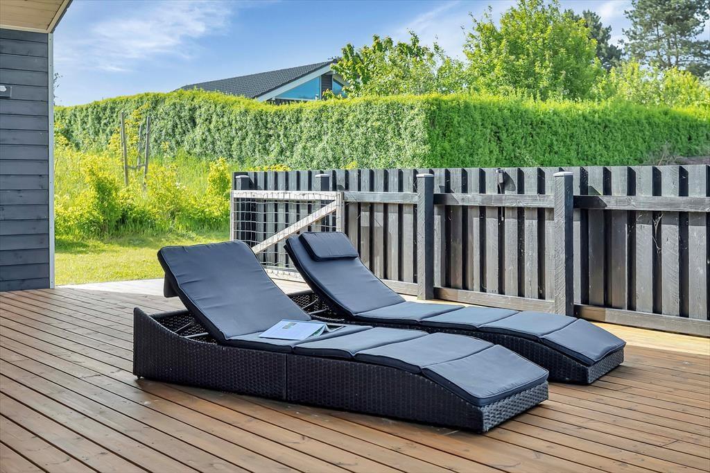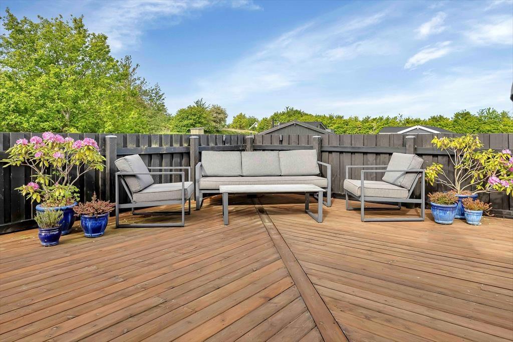 Huset er lyst og rummeligt og indeholder stue med store panoramavinduer, fjernsyn med chromecast samt varmepumpe. Køkkenet er åbent og indeholder opvaskemaskine og mikroovn. Spisepladsen indbyder til hyggelige stunder for hele familien. Grundet panoramavinduer i hele stue/køkkenområdet, er lysindfaldet perfekt. Der er 3 gode soveværelser, hvoraf det ene er med dobbeltseng på 150x200cm og de 2 med enkeltsenge, der kan sættes sammen til dobbeltsenge. Huset er omgivet af en kæmpestor og smuk træterrasse, som giver en naturlig forlængelse af stue og køkken og med meget plads til at boltre sig. Terrassen på over 100m2 er indhegnet og derfor oplagt til leg for børn. Terrassen indeholder også dejlig udebruser til varme dage efter strandbesøg eller leg. Grunden er naturgrund med shelter og bålsted.