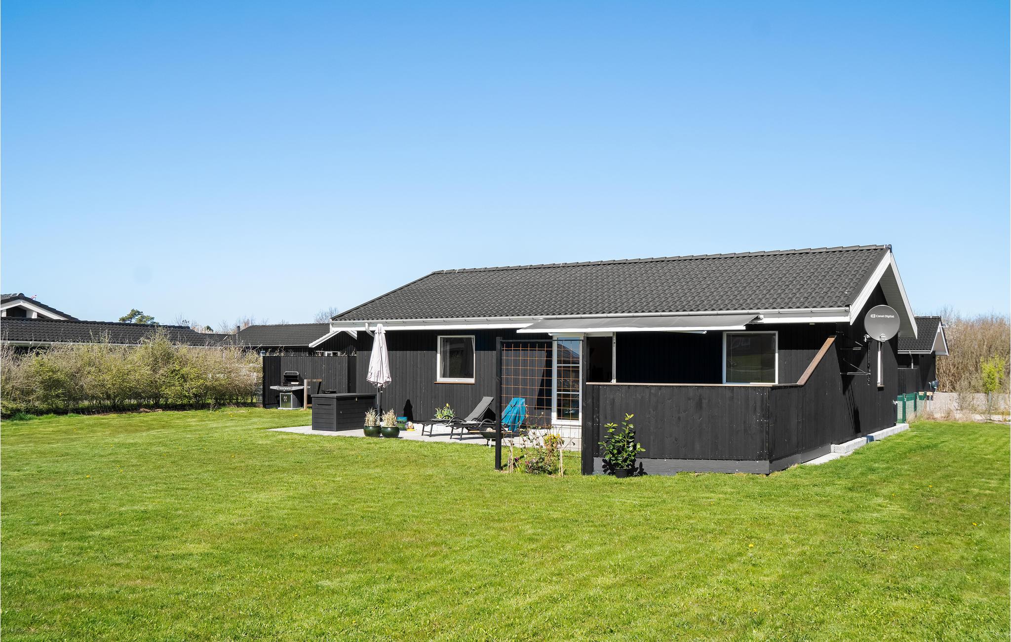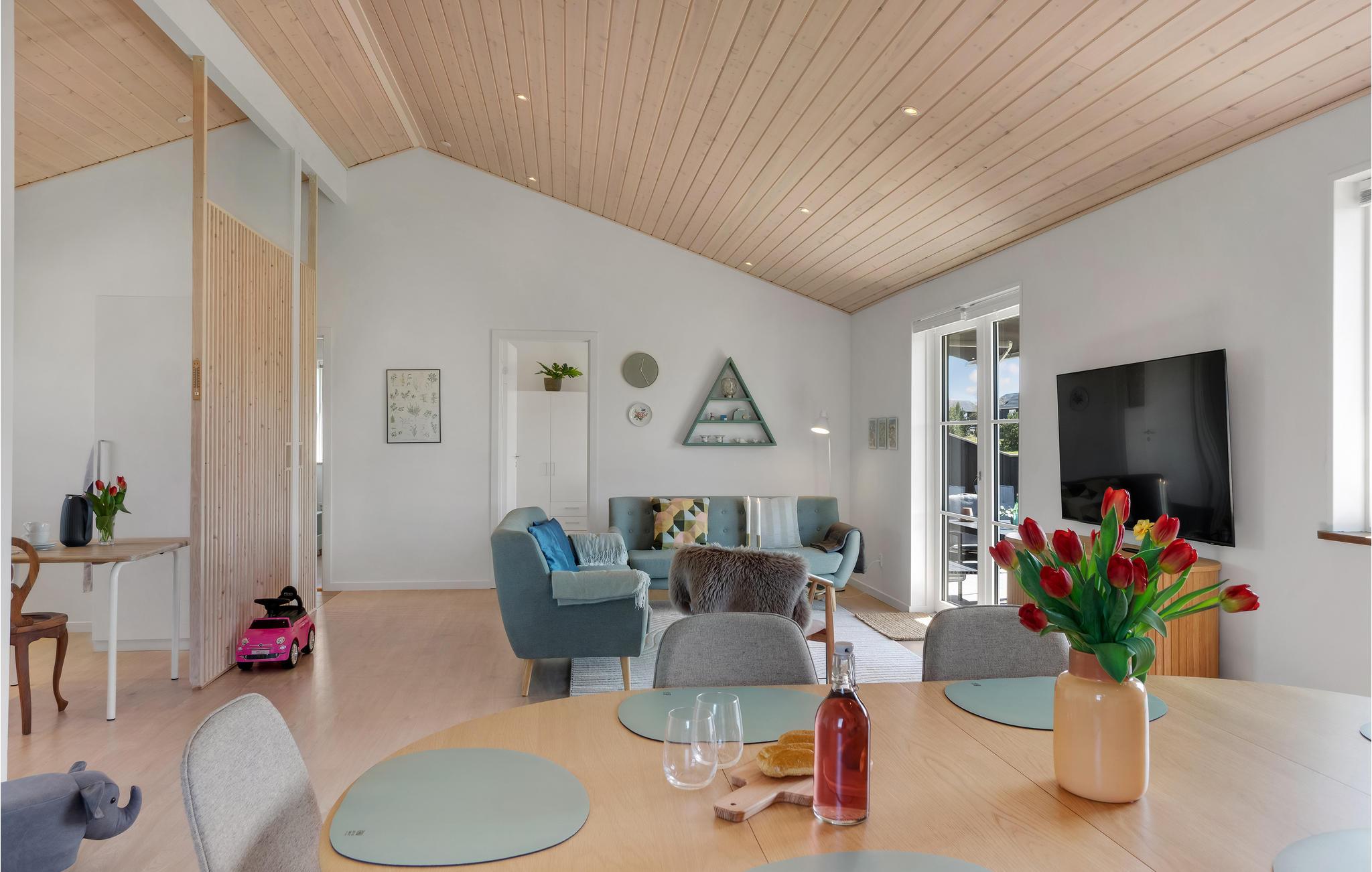 Hyggeligt feriehus tæt på strand med moderne indretning og stor have til leg og afslapning.