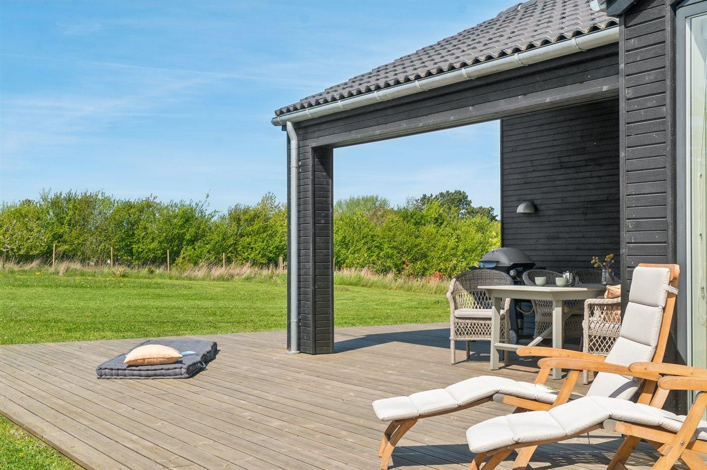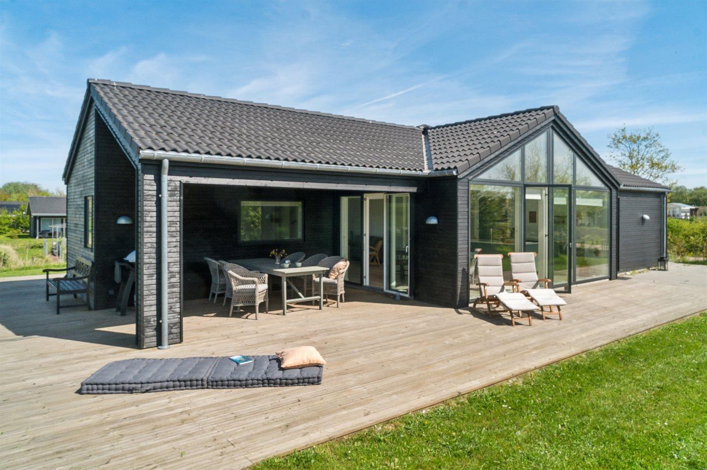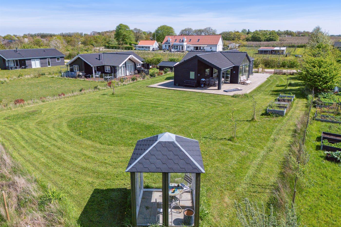 Huset er beliggende i en ny udstykning omgivet af andre flotte og nye sommerhuse - direkte ud til et grønt fællesområde. Rundt om huset findes der en 140 m2 stor træterrasse – dertil kommer der 19 m2 overdækket terrasse samt udebruser og lademulighed af el-biler.