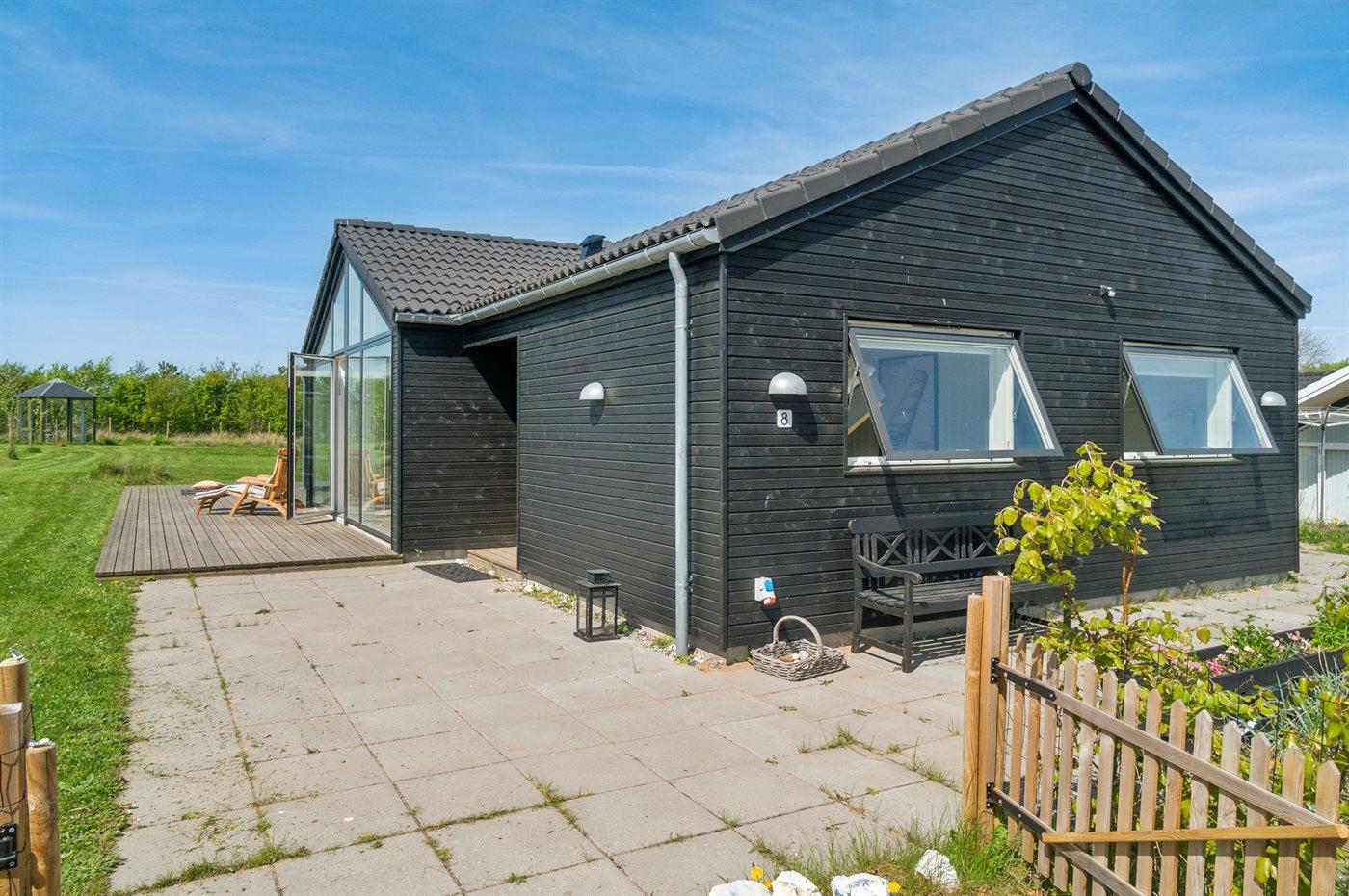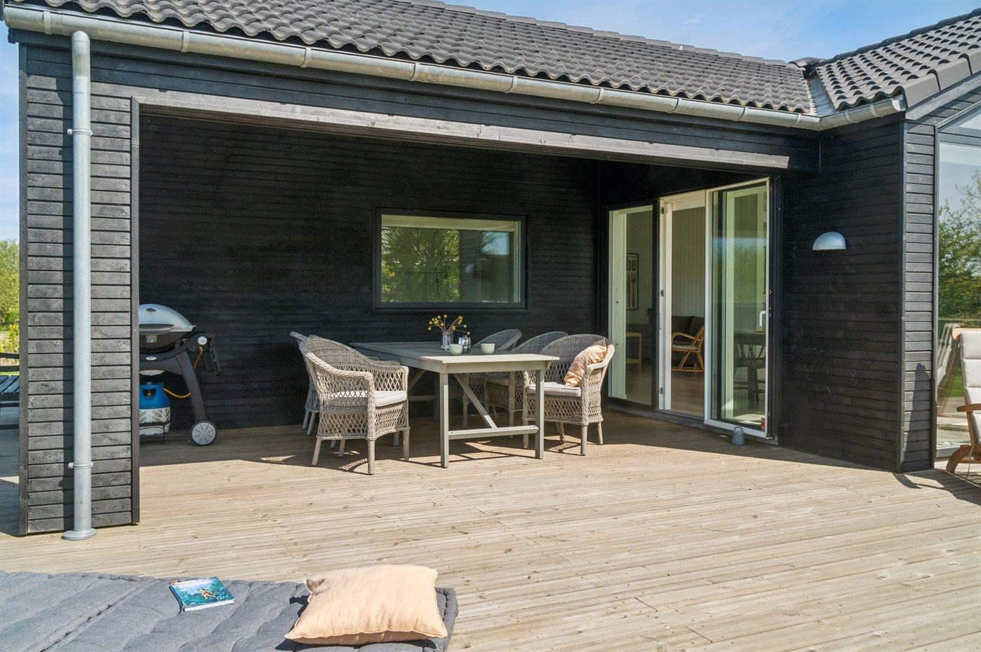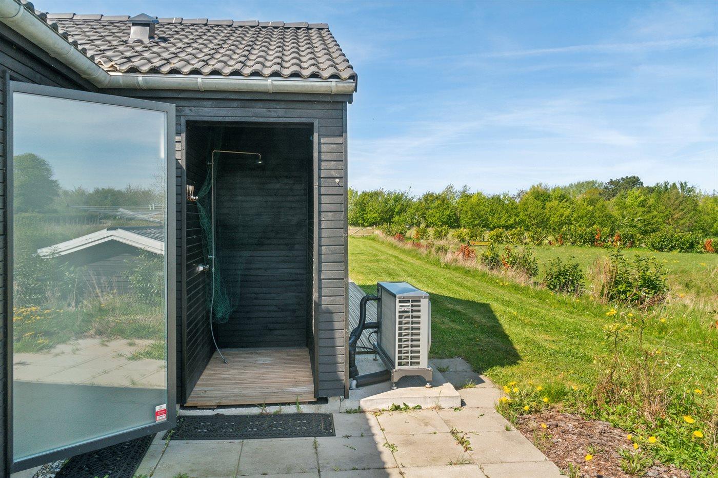 Huset er beliggende i en ny udstykning omgivet af andre flotte og nye sommerhuse - direkte ud til et grønt fællesområde. Rundt om huset findes der en 140 m2 stor træterrasse – dertil kommer der 19 m2 overdækket terrasse samt udebruser og lademulighed af el-biler.