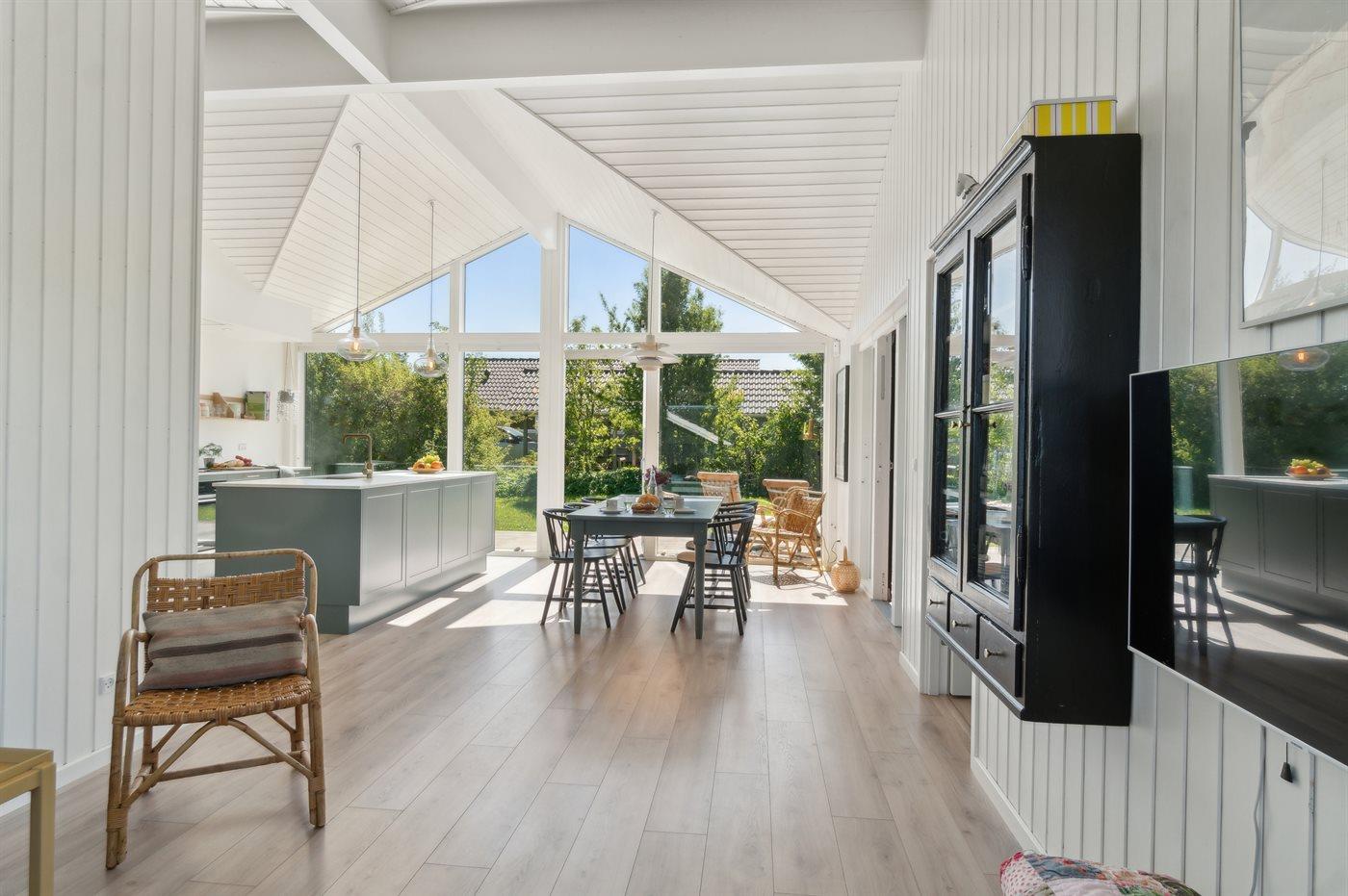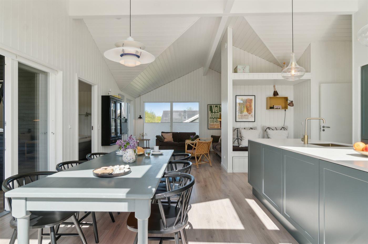 Køkken, spiseplads og stue ligger i åben forbindelse med hinanden og udgør det naturlige samlingssted for hygge og samvær. I køkkenalrummet er der også en alkove som er oplagt til afslapning og hygge. Huset er indrettet med 3 soveværelser med hver 2 sovepladser samt 2 badeværelser med gulvvarme, bruseniche. I det ene badeværelse findes der desuden vaskemaskine og tørretumbler.