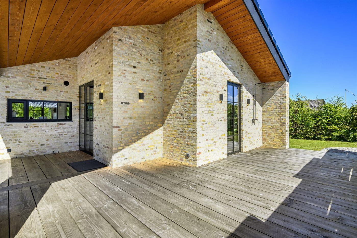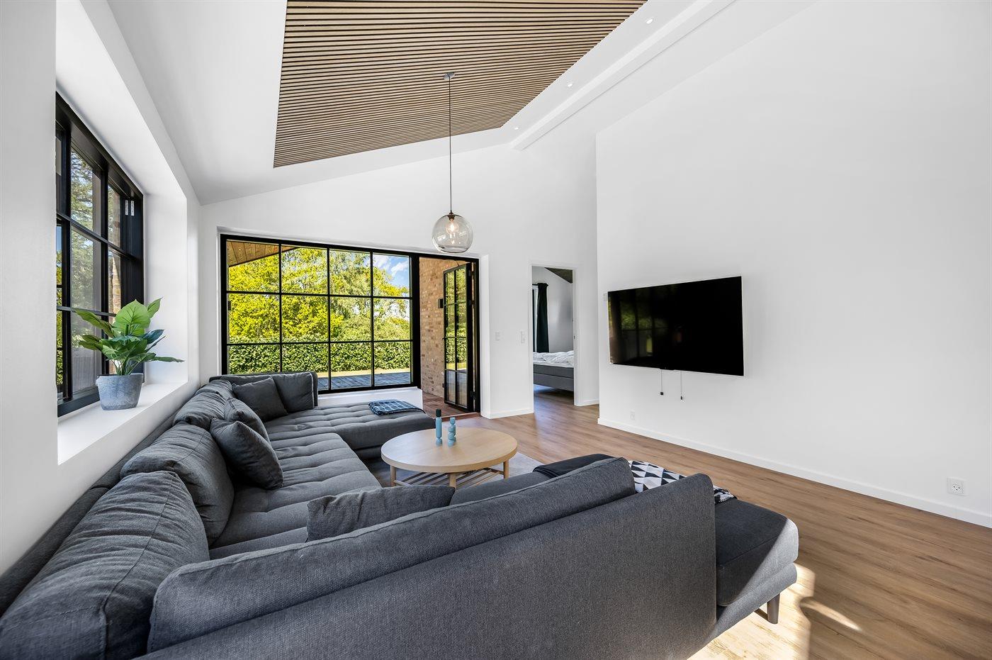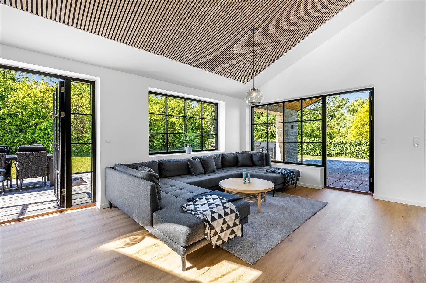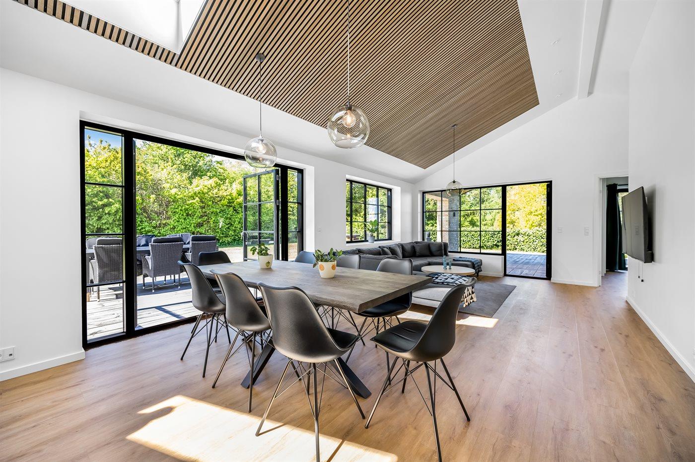 Husets naturlige samlingssted er det store lyse køkkenalrum i åben forbindelse med stuen og med udgange til det store terrasseområde med gode overdækkede arealer, hvor det både er muligt at nyde solen og finde skygge og læ. Huset er overalt opført i kvalitetsmaterialer, og med loft-til-kip og masser af lysindfald fra de store vinduespartier og ovenlysvinduer er huset en sand fornøjelse at opholde sig i.