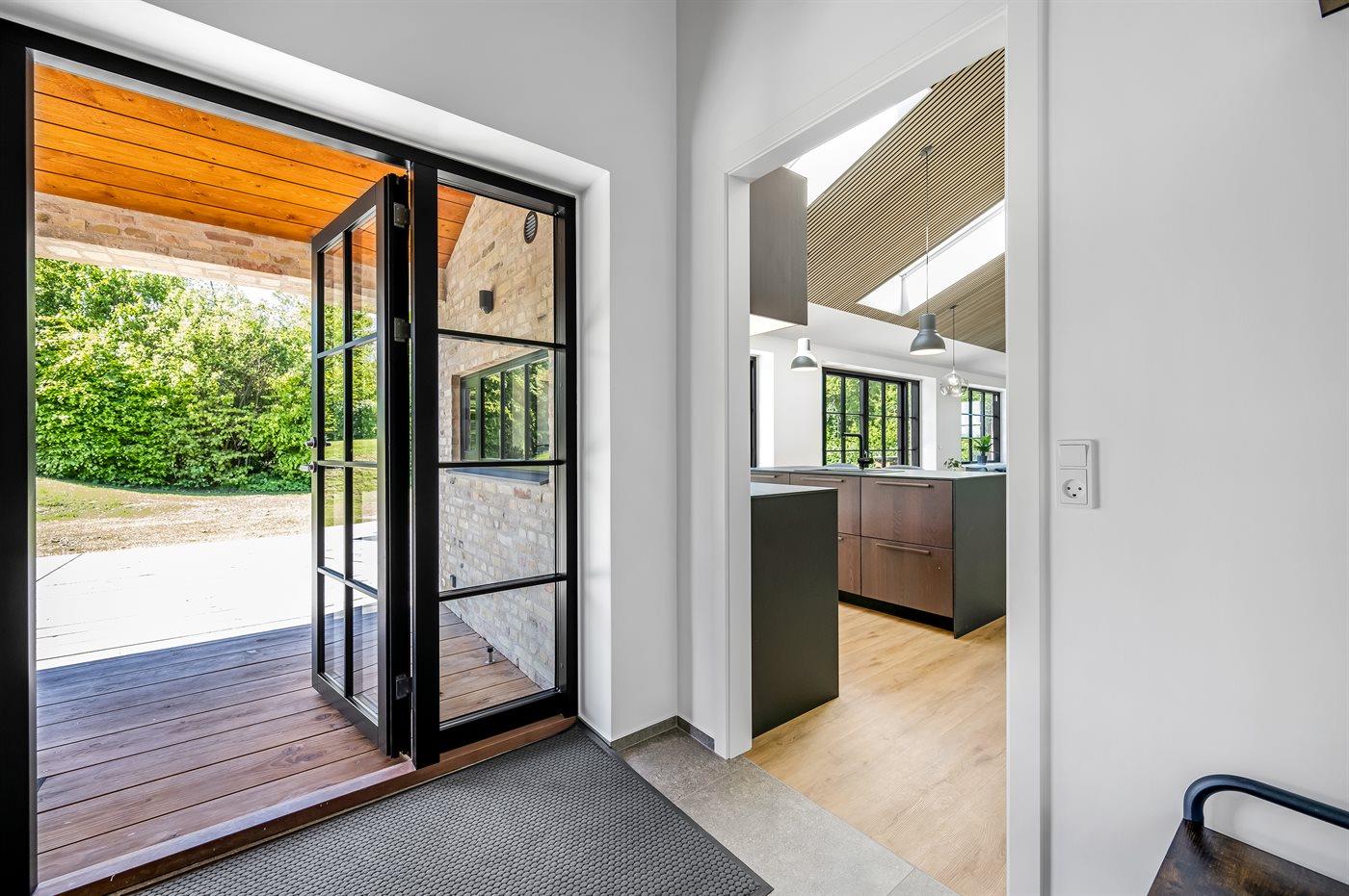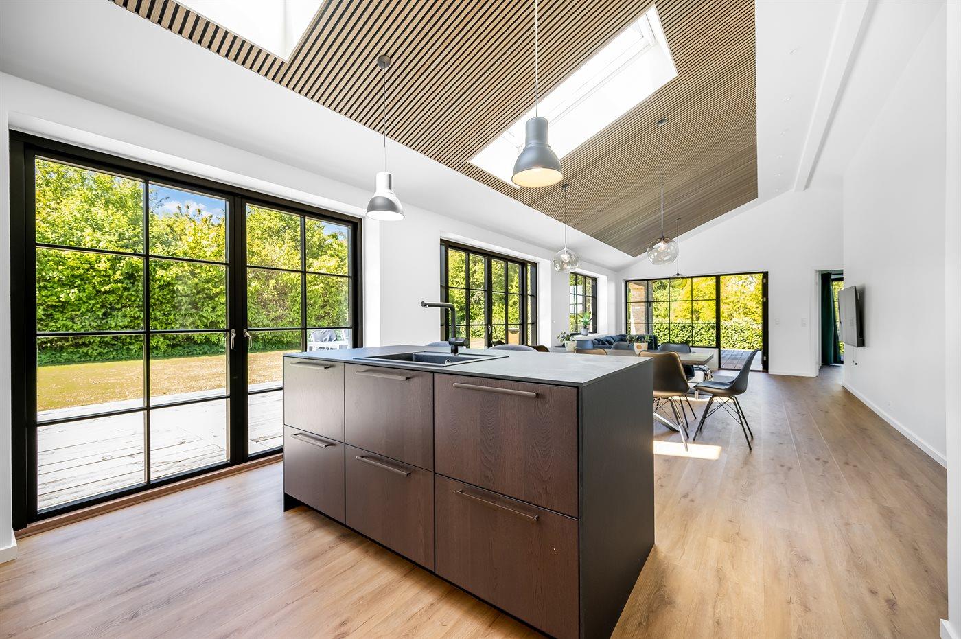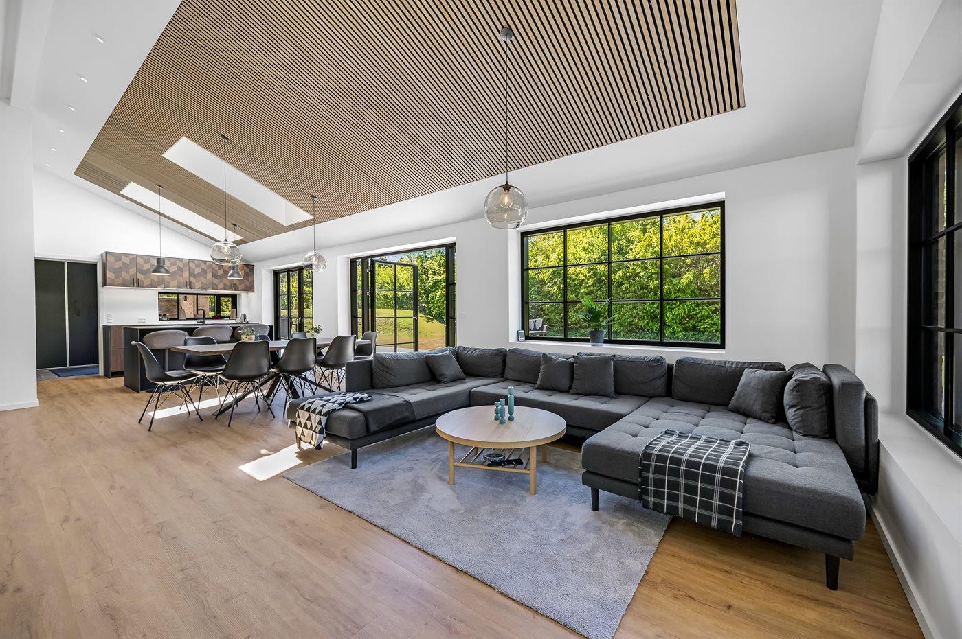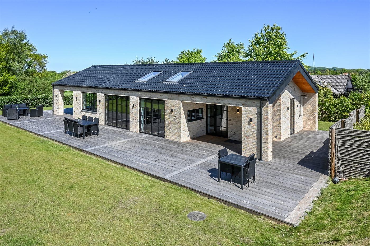 Husets naturlige samlingssted er det store lyse køkkenalrum i åben forbindelse med stuen og med udgange til det store terrasseområde med gode overdækkede arealer, hvor det både er muligt at nyde solen og finde skygge og læ. Huset er overalt opført i kvalitetsmaterialer, og med loft-til-kip og masser af lysindfald fra de store vinduespartier og ovenlysvinduer er huset en sand fornøjelse at opholde sig i.