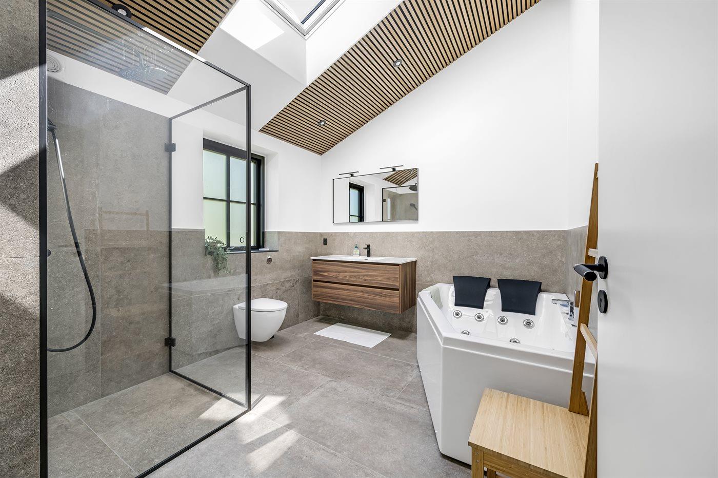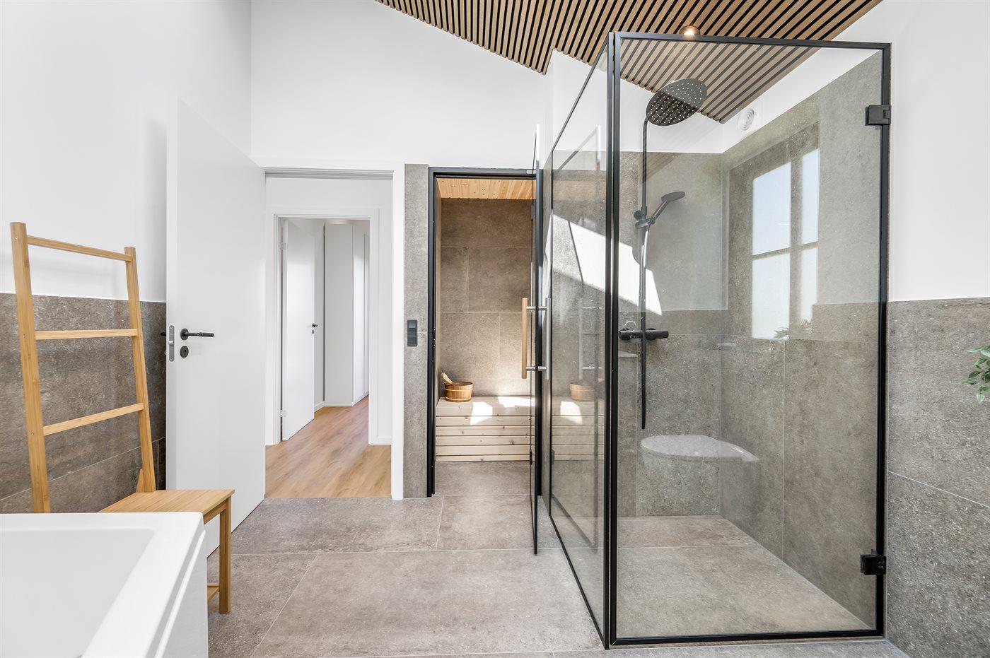 Der er 2 badeværelser med bruseniche og 2 toiletter. Der er gulvvarme på 2 badeværelser. I saunaen er der mulighed for afslapning.