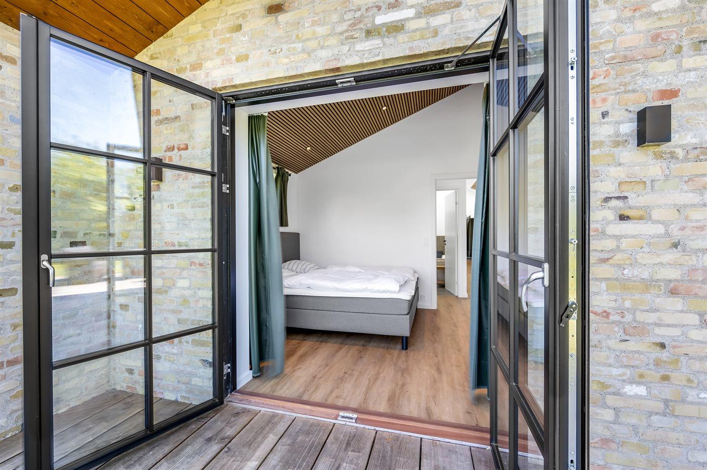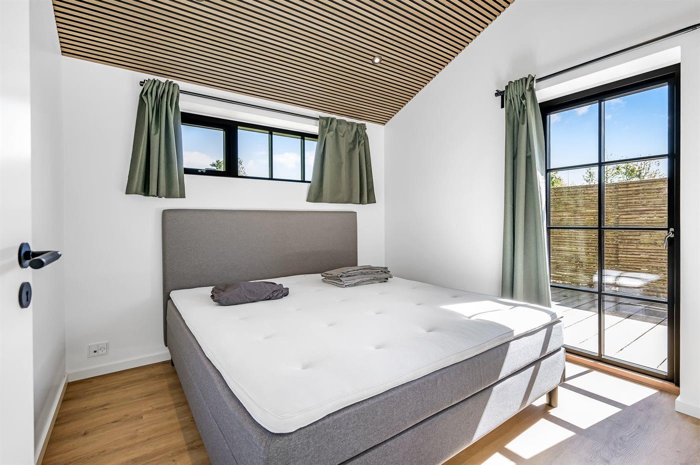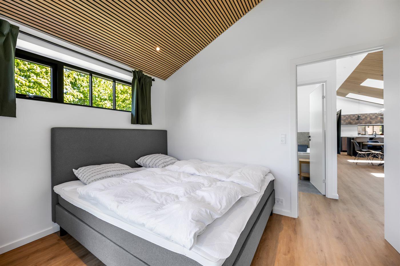 Der er 4 soveværelser med hver 2 sovepladser i dobbeltsenge. Fra alle soveværelser er der terrassedøre med nem adgang til den udendørs bruser. Der er 2 badeværelser med bruseniche og gulvvarme. I det største badeværelse er der spa og sauna. I entreen er der vaskemaskine og tørretumbler.