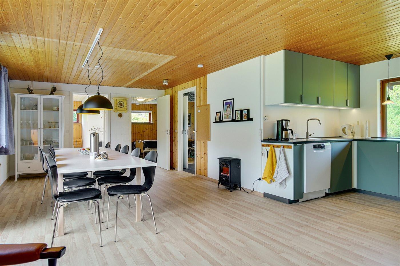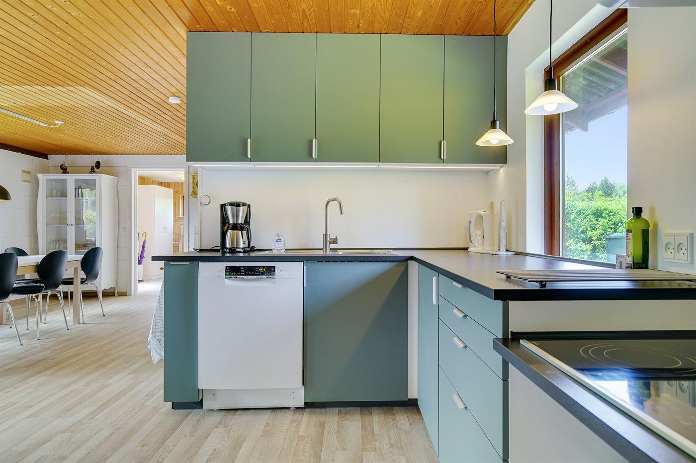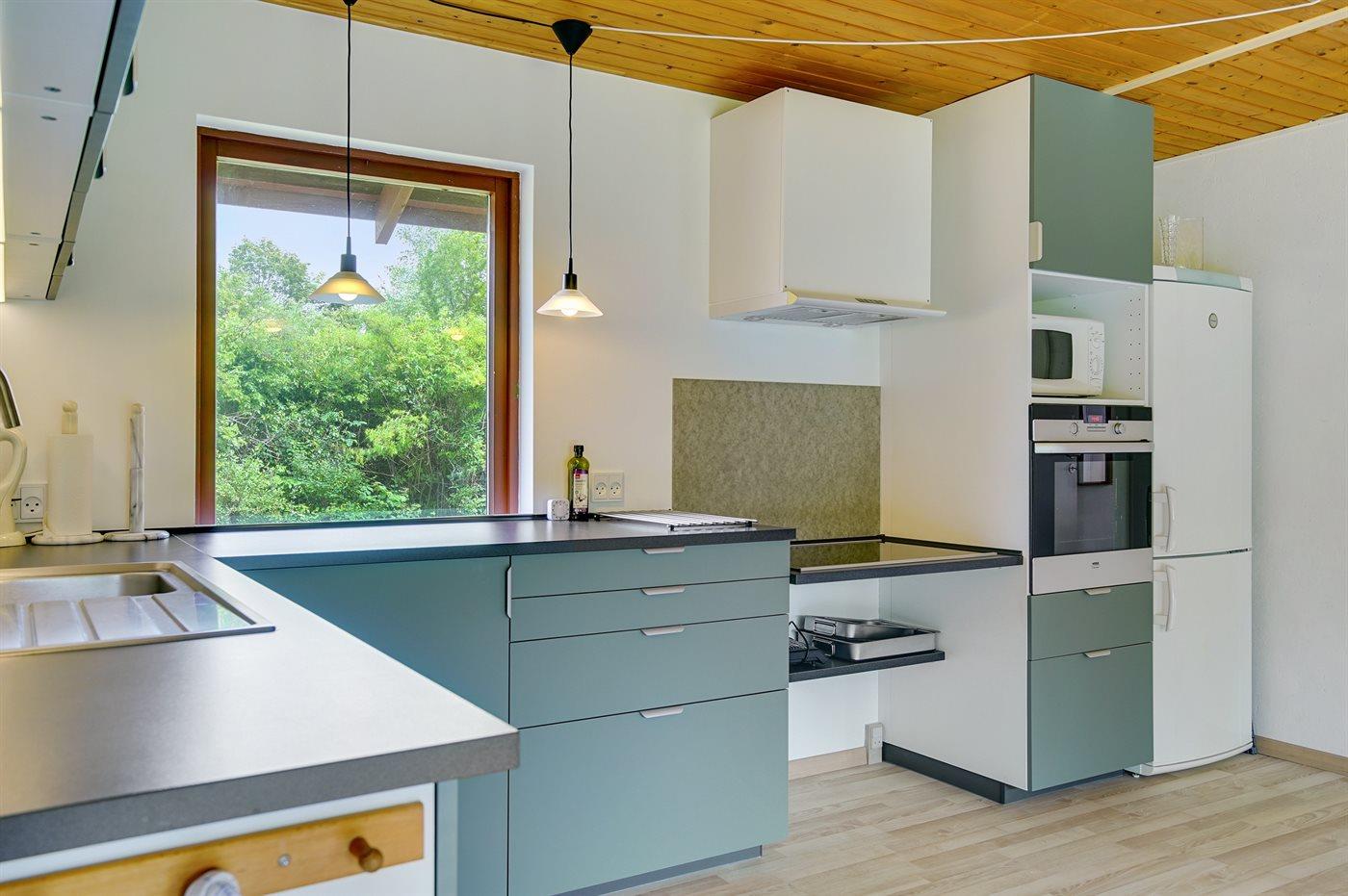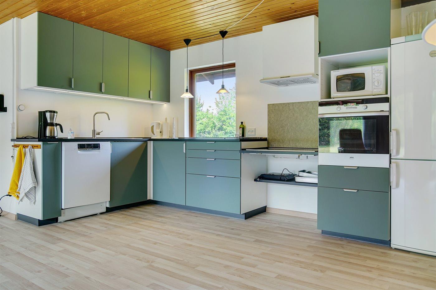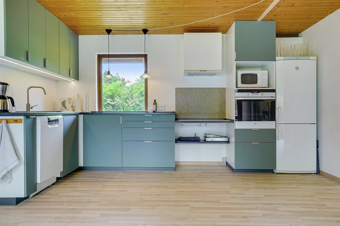 Køkkenet er udstyret med 1 køleskab. Der er 5 keramiske kogeplader, varmluftovn, mikrobølgeovn samt opvaskemaskine.