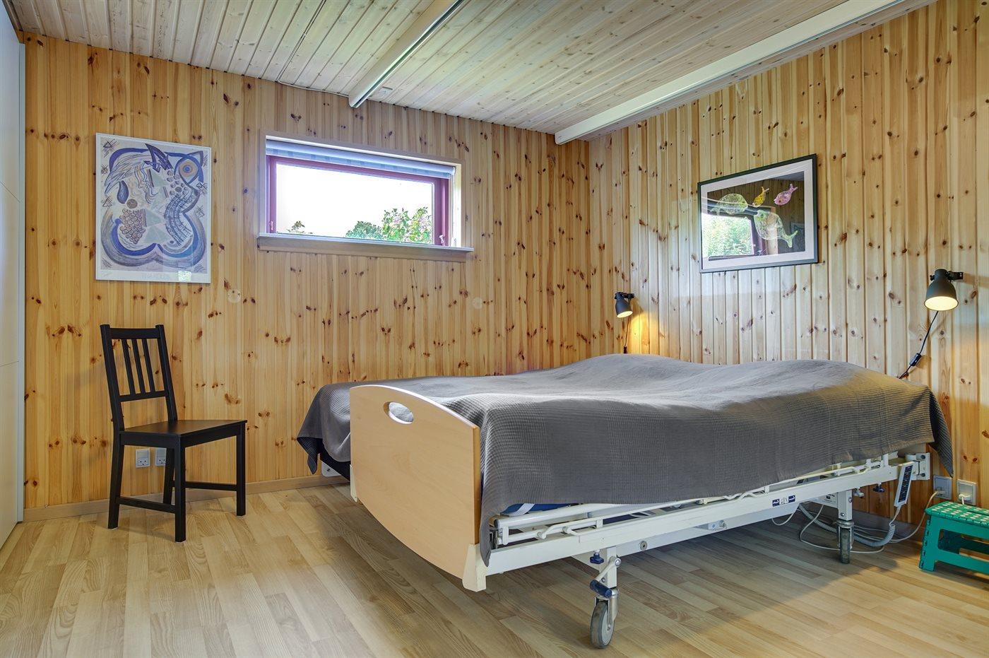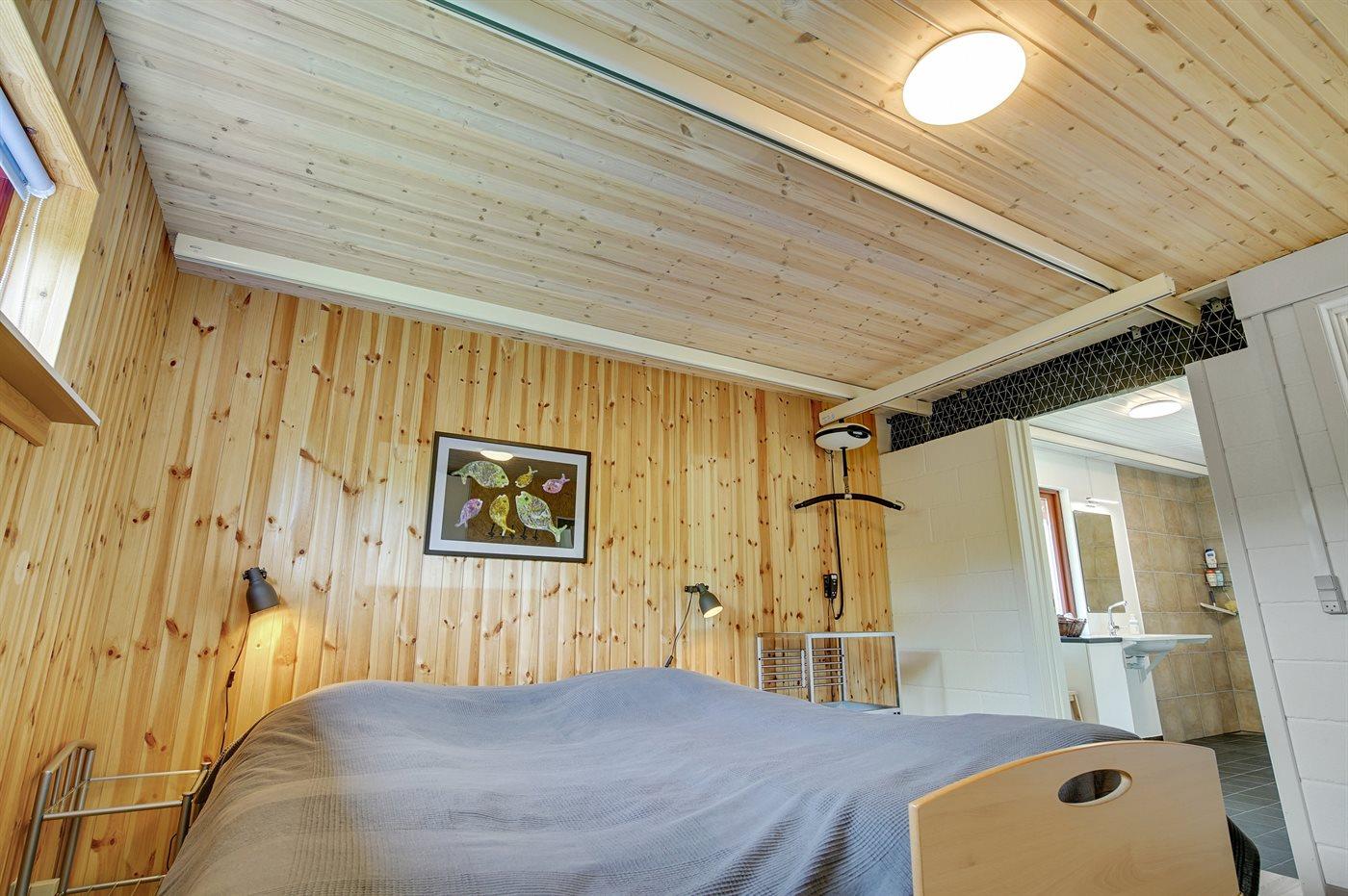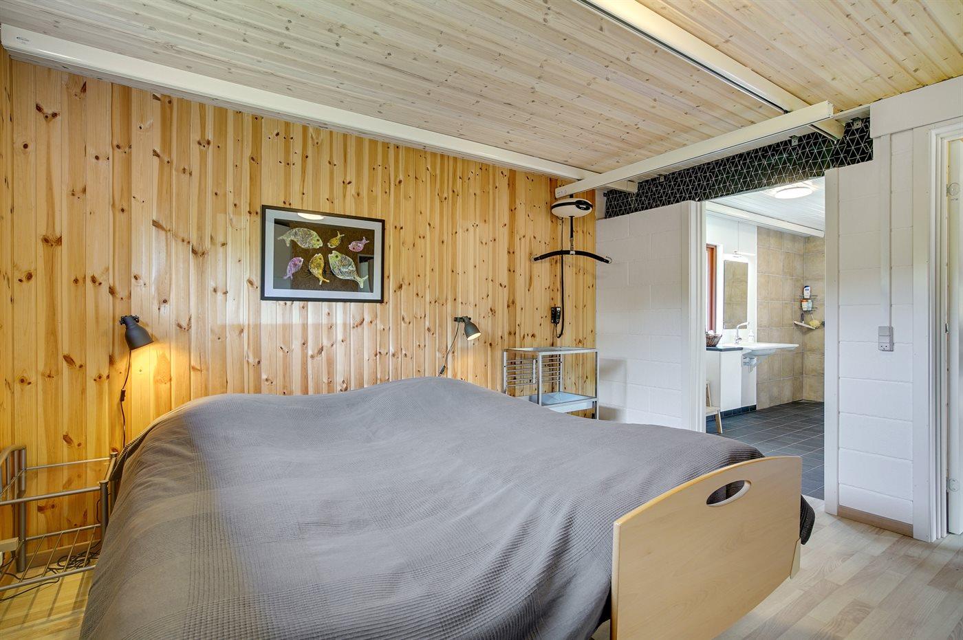 Flot og rummeligt sommerhus indrettet til kørestolsbruger. Til huset hører et anneks, hvor 2 af sovepladserne befinder sig. Annekset er egnet til at overnatte i fra påske til og med oktober. Desuden er 2 sovepladser at finde på sovesofa i husets opholdsstue. Alle indvendige døre i huset er 90 cm. brede og uden dørtrin. Der er loftslift i det store soveværelse og badeværelset - liften kører via en skinne i loftet gennem døren imellem disse 2 rum. Toilettet er 8 m², og der er fri plads under håndvasken. I brusehjørnet er der god plads til f.eks. en badestol. Badeværelset har en terrassevarmer, som kan sørge for hurtig ekstra varme ved f.eks. badning. Soveværelset er udstyret med en 4 punkts plejeseng. I køkkenet er der fri plads under kogepladerne.