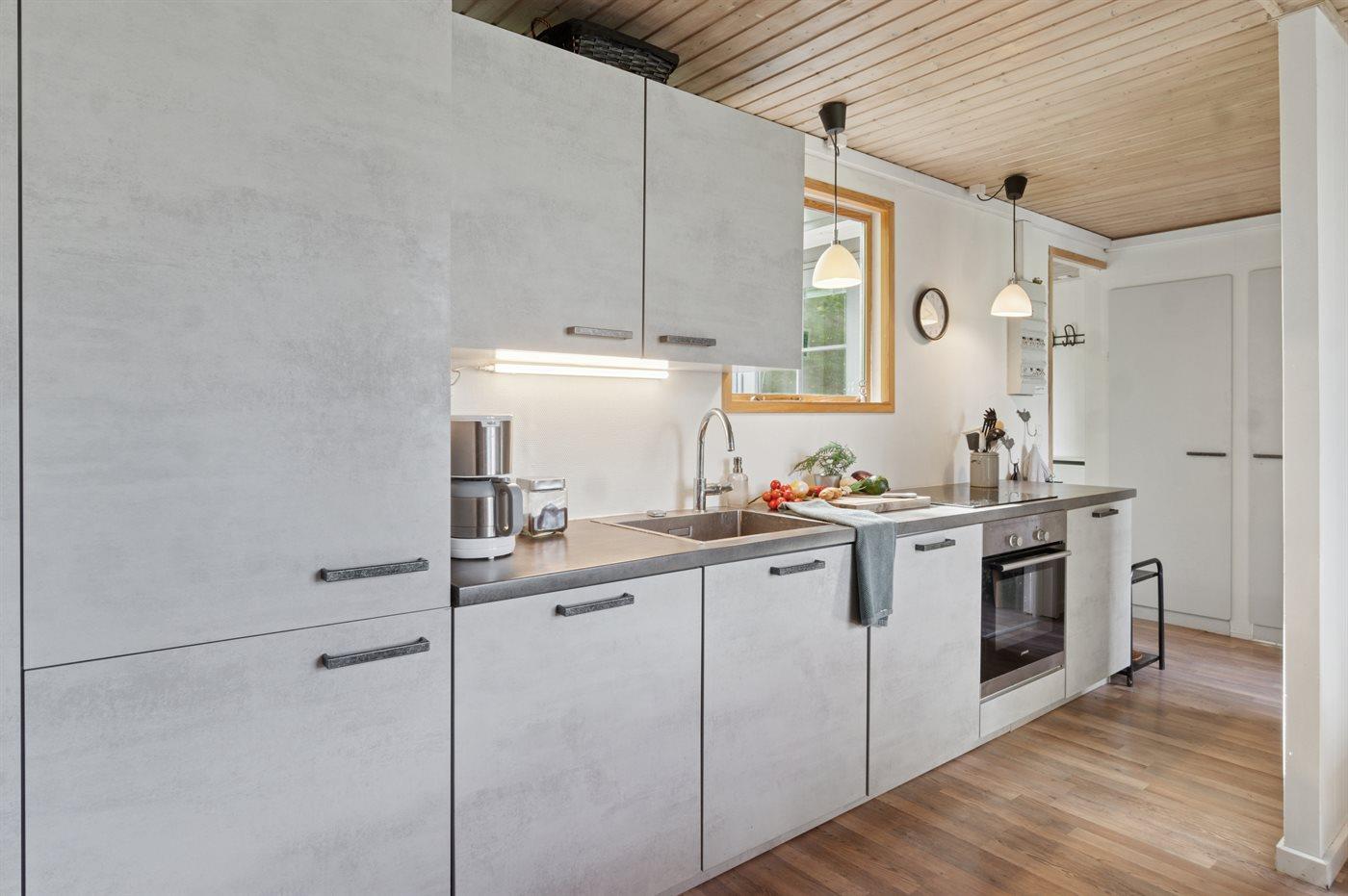 Huset indeholder et dejligt køkkenalrum i åben forbindelse med stuen og, herfra er der udgang til en stor overdækket terrasse, hvor der er god mulighed for at finde skygge og læ og nyde de lange sommeraftener.