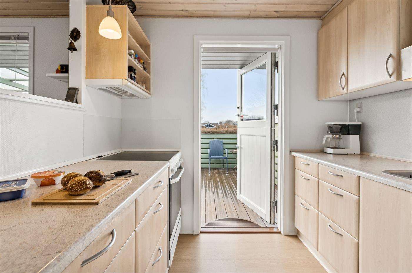Køkkenet er udstyret med 1 køleskab. Der er 4 keramiske kogeplader, varmluftovn, mikrobølgeovn samt opvaskemaskine.