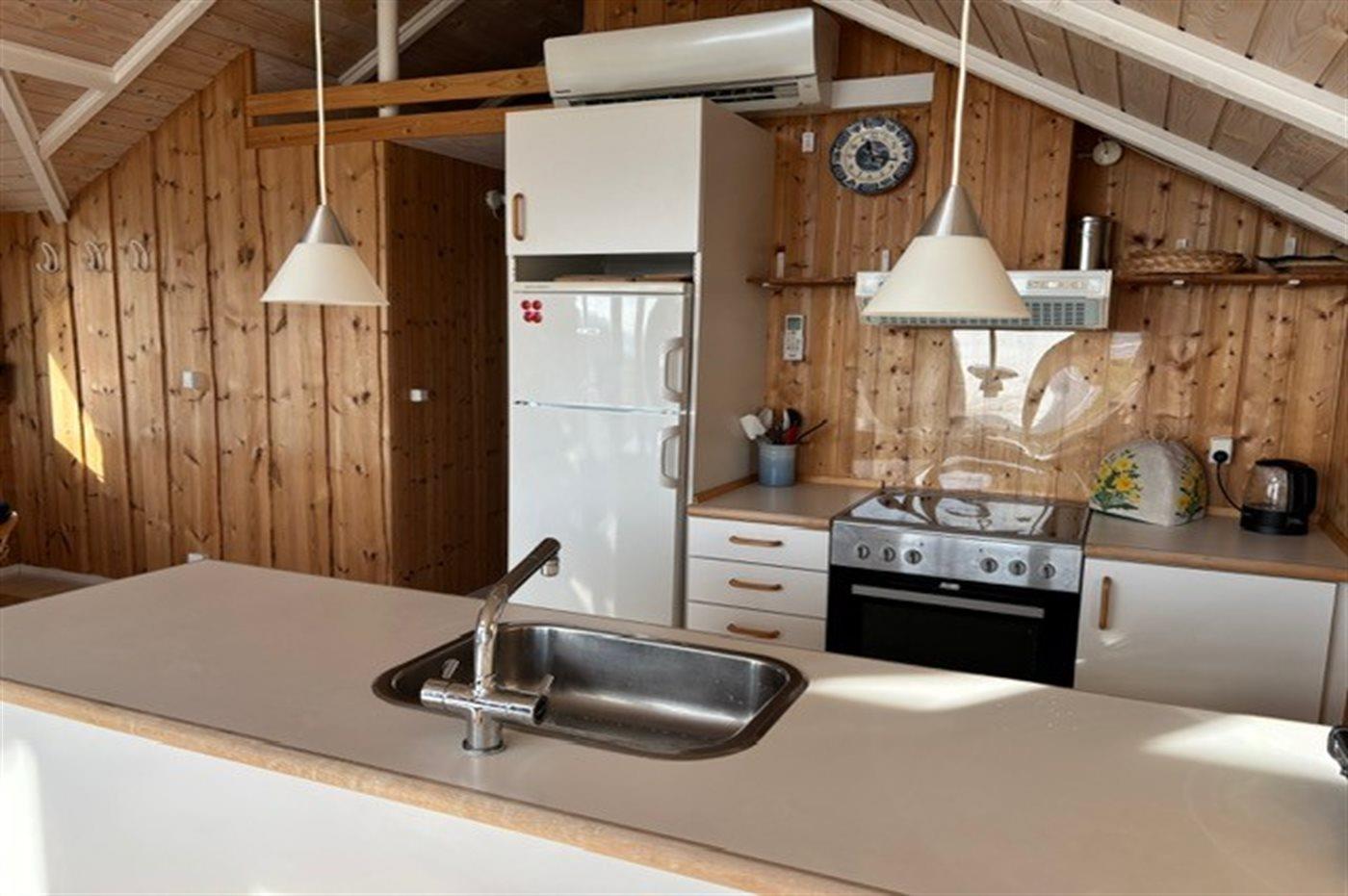 Køkkenet er udstyret med 1 køleskab. Der er 4 keramiske kogeplader, varmluftovn.