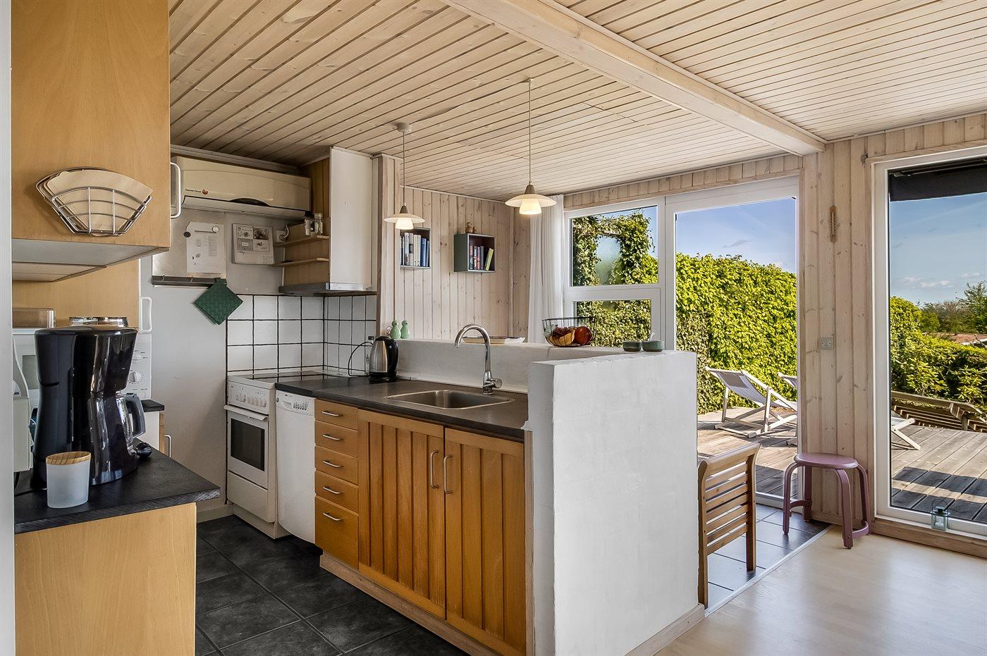 Køkkenet er udstyret med 1 køleskab. Der er 4 keramiske kogeplader, varmluftovn, mikrobølgeovn samt opvaskemaskine.