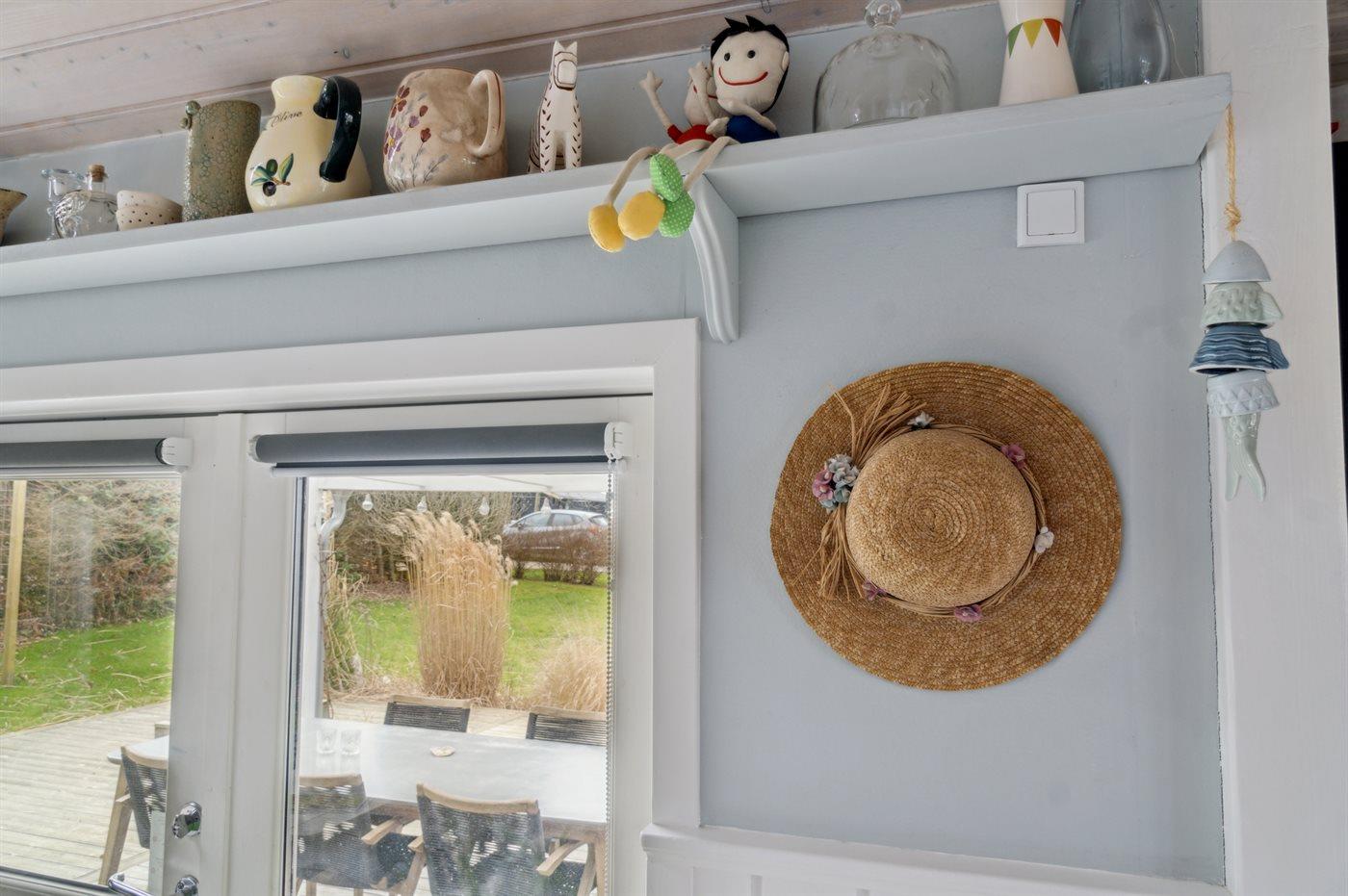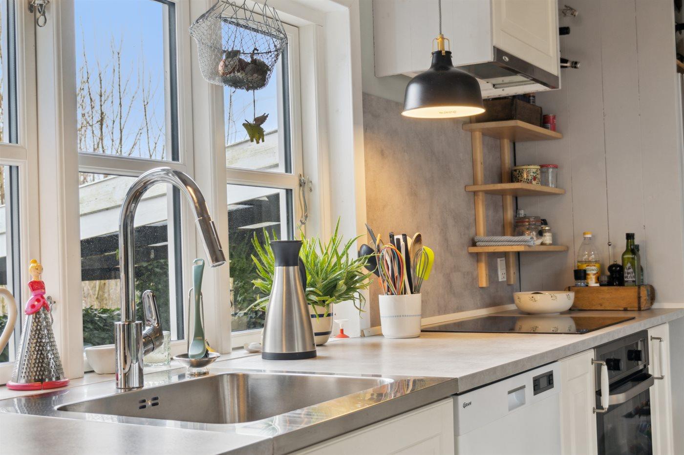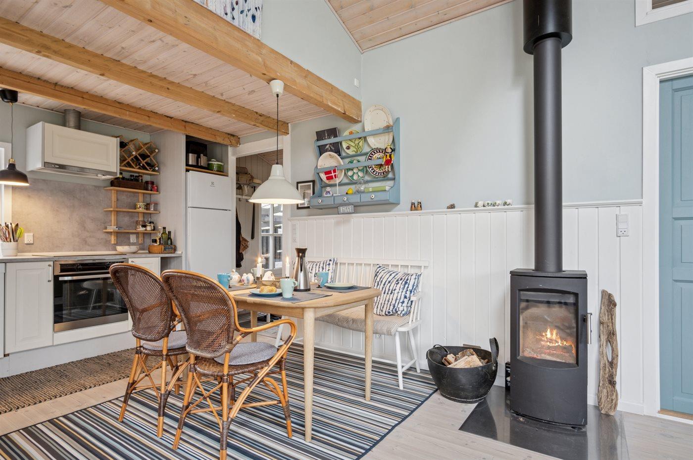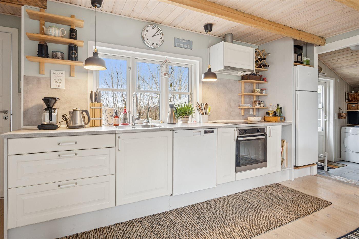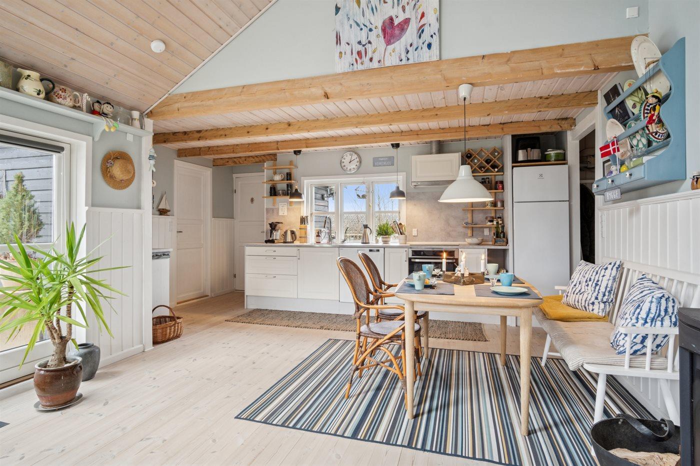 Køkkenet er udstyret med 1 køleskab. Der er 4 keramiske kogeplader, miniovn, varmluftovn samt opvaskemaskine.