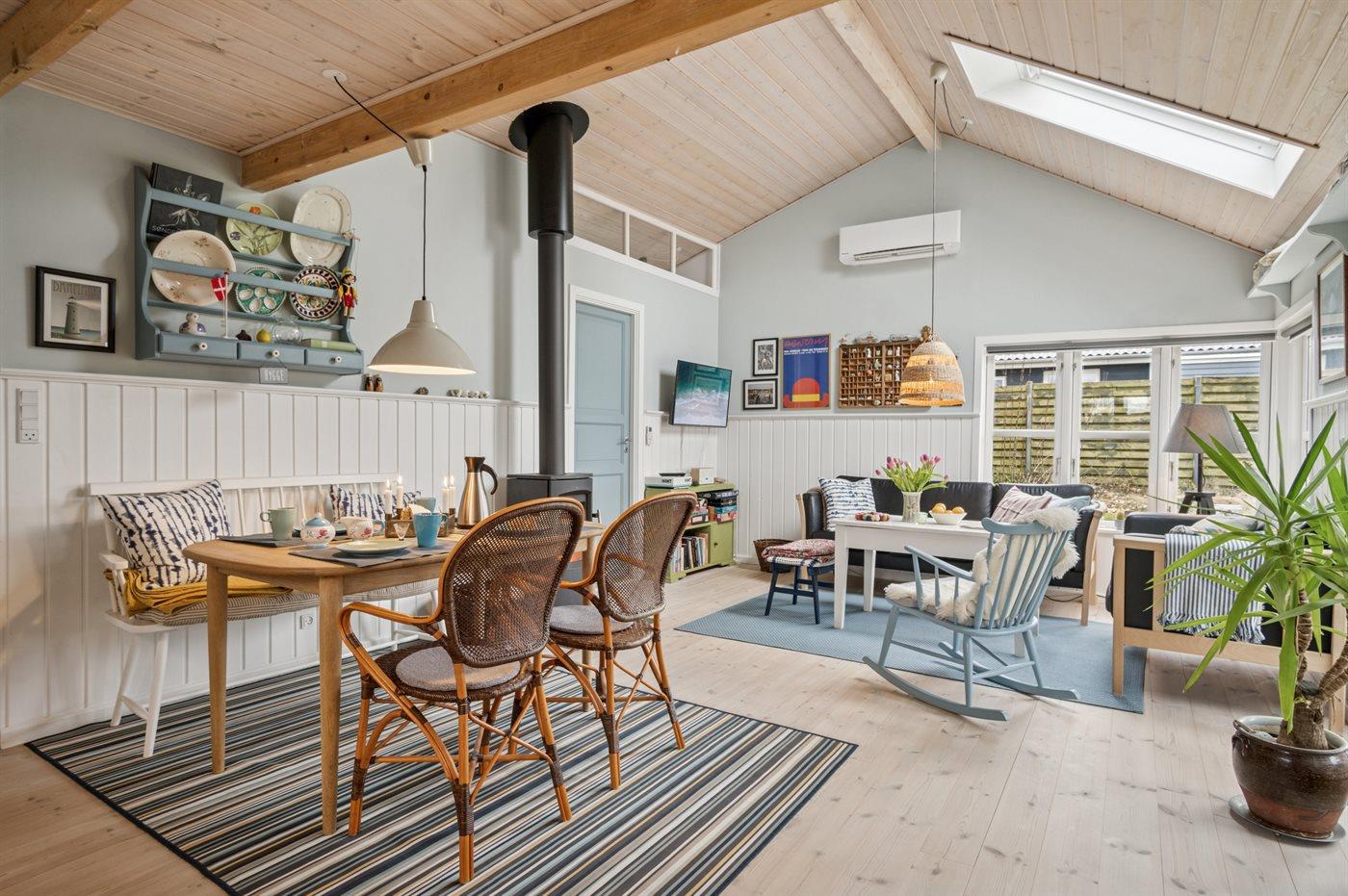 Hyggeligt sommerhus tæt på børnevenlig strand med renoveret køkken og energibesparende varmepumpe.