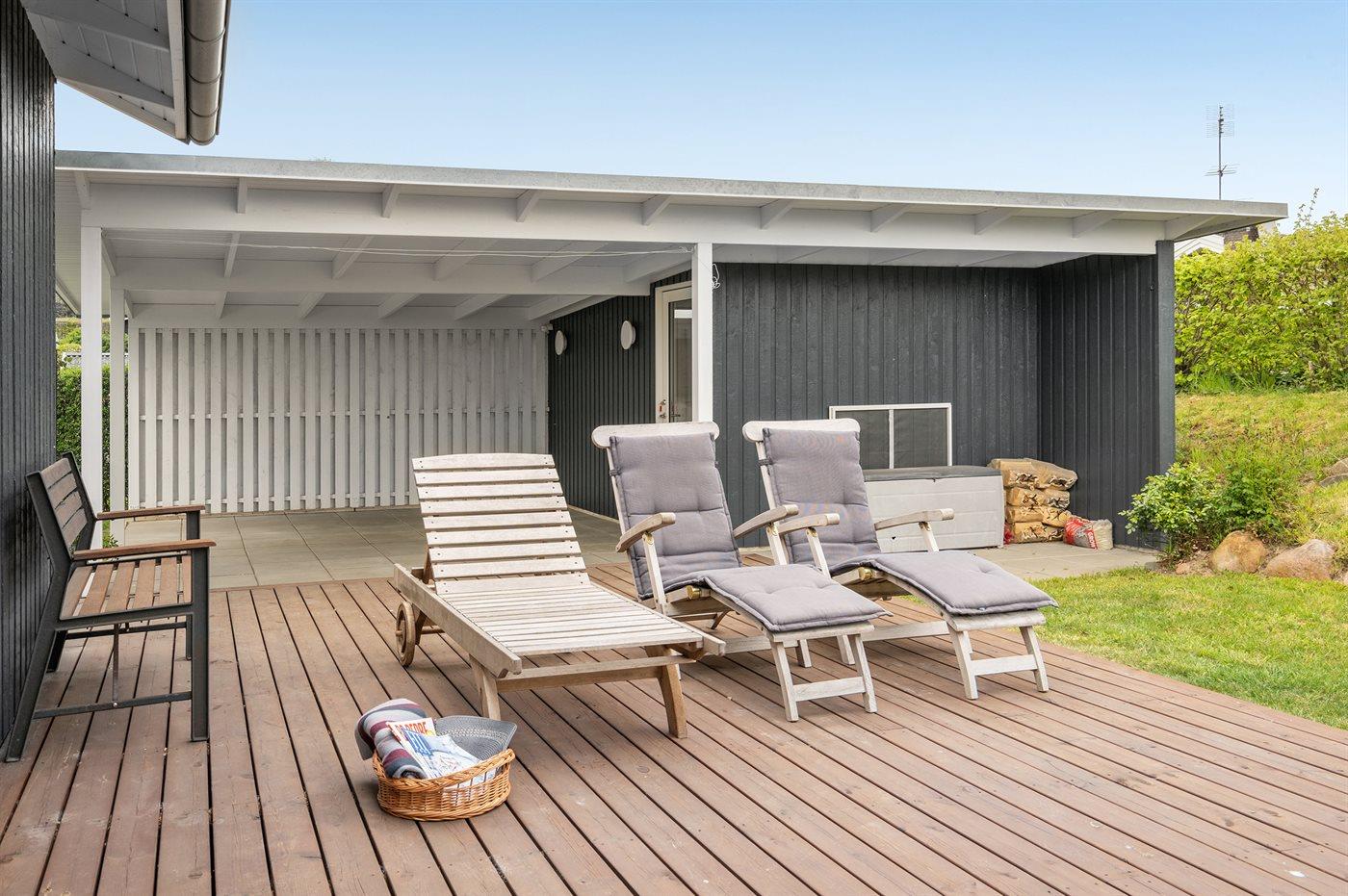 Ferieboligen er beliggende på en 800 m² stor havegrund. Der er 700 m til havet. Nærmeste forretning er beliggende i en afstand af 2000 m. Til ferieboligen hører 40 m² terrasseareal. Desuden er der 35 m² overdækket terrasse. Heraf i alt 12 m² lukket terrasse. Der er carport til rådighed. Parkering ved ferieboligen.