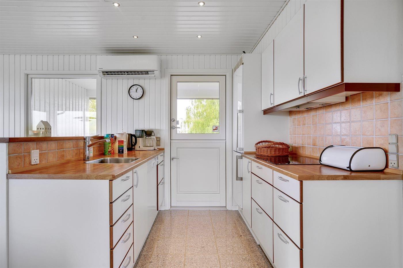 Køkkenet er udstyret med 1 køleskab. Der er 4 keramiske kogeplader, varmluftovn, mikrobølgeovn samt opvaskemaskine Der er gulvvarme i køkkenet.