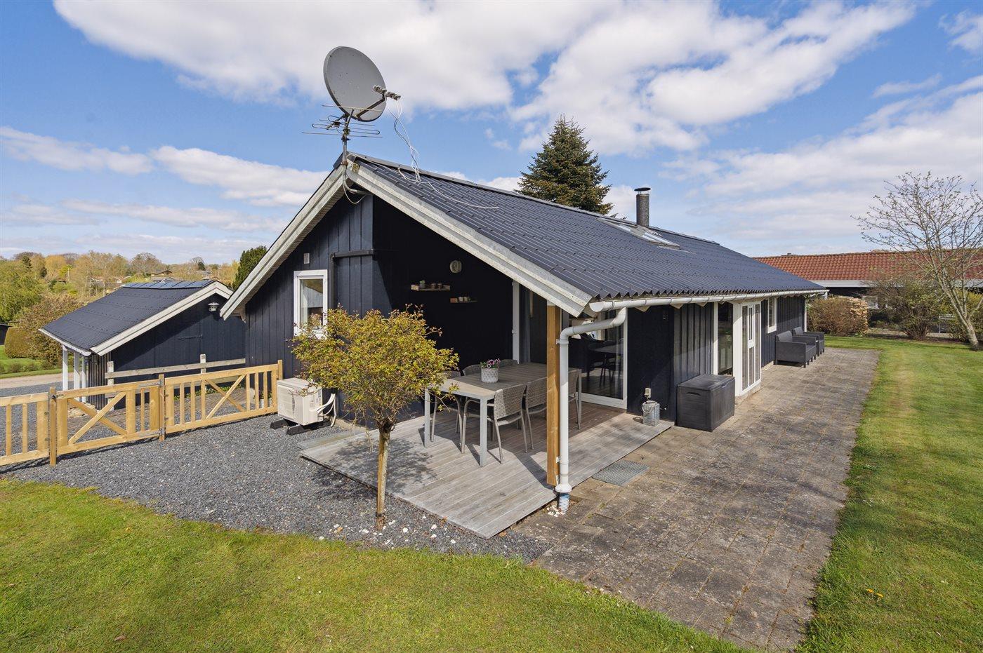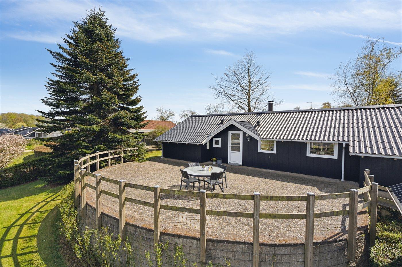 Sommerhus beliggende på en skrånende grund, på en lukket vej, i et sommerhusområde mellem Lillebælt og fjorden Hejls Nor, hvor der fra grunden er kik til fjorden.