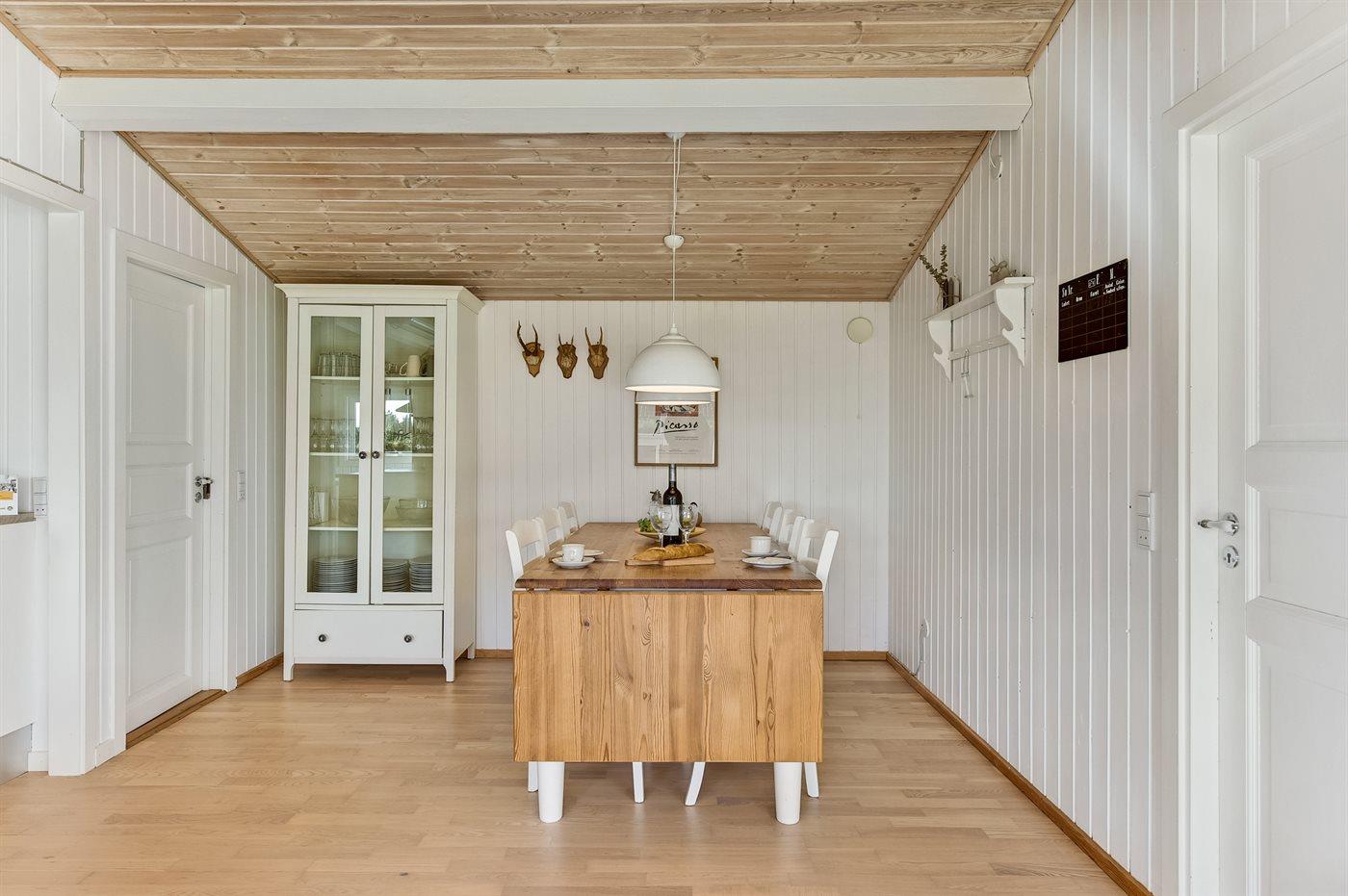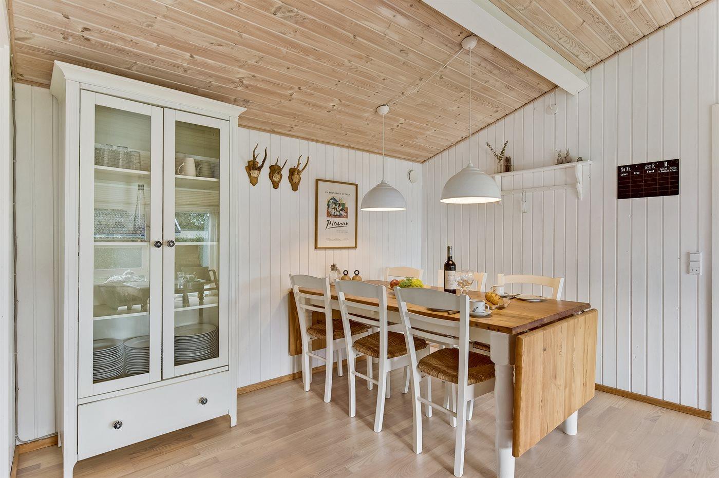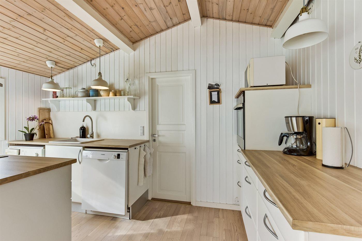 Køkkenet er udstyret med 1 køleskab. Der er 4 keramiske kogeplader, bageovn, mikrobølgeovn samt opvaskemaskine.