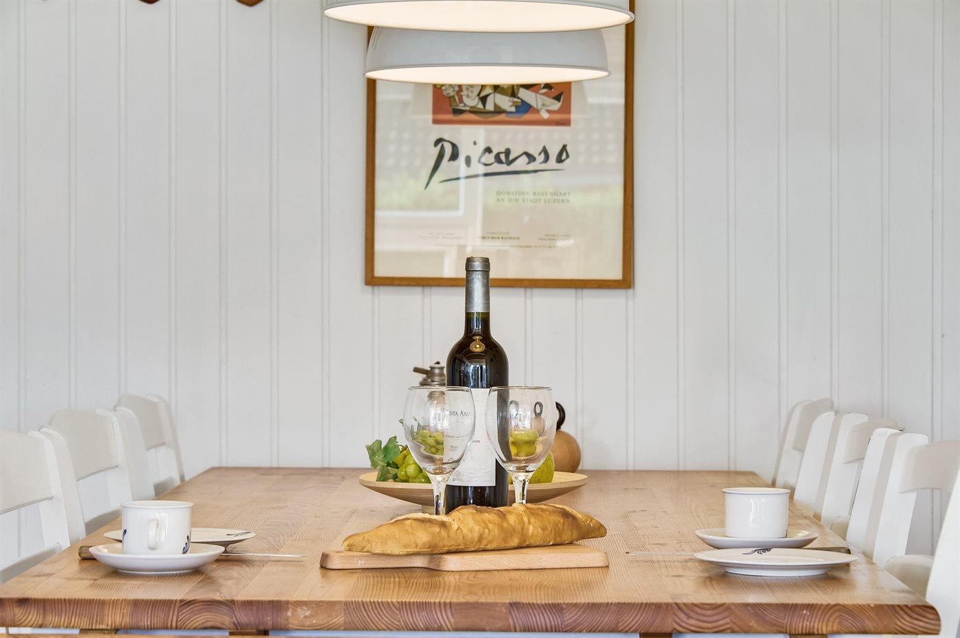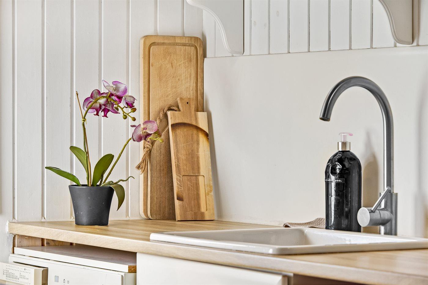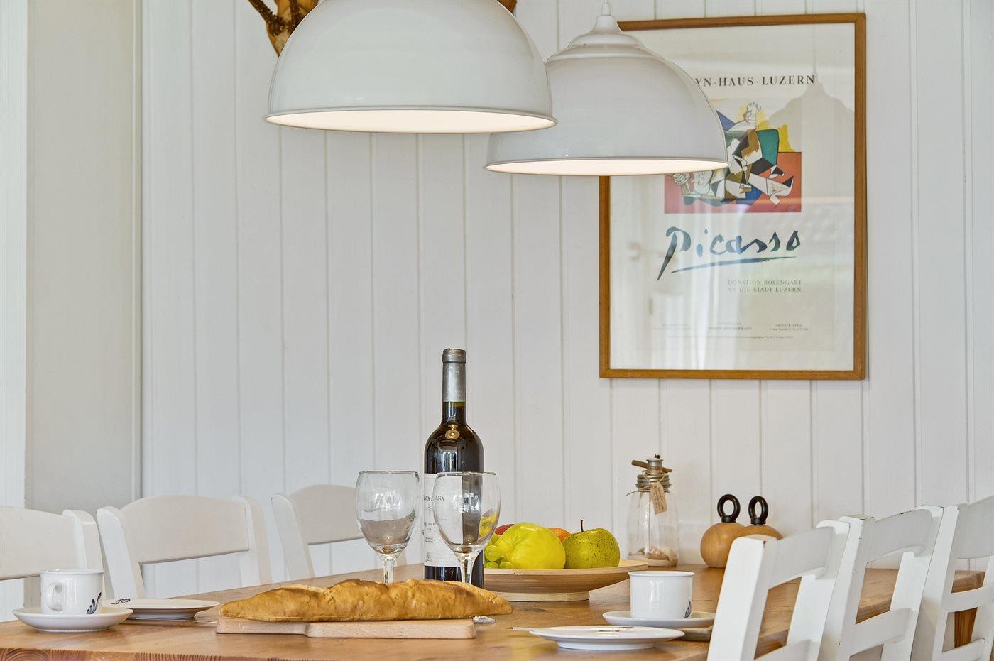 Køkkenet er udstyret med 1 køleskab. Der er 4 keramiske kogeplader, bageovn, mikrobølgeovn samt opvaskemaskine.