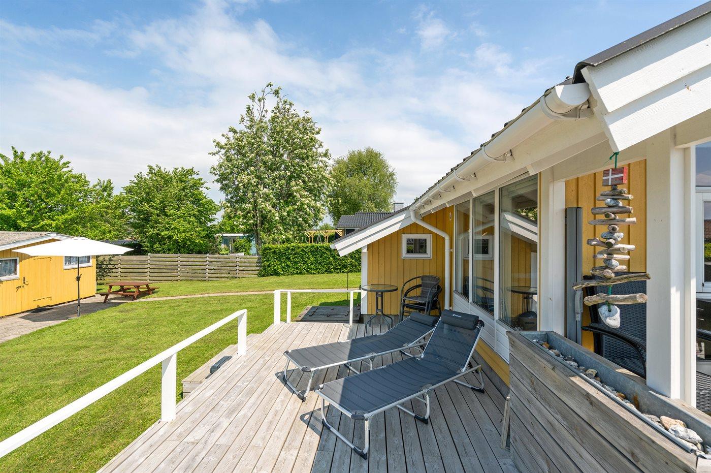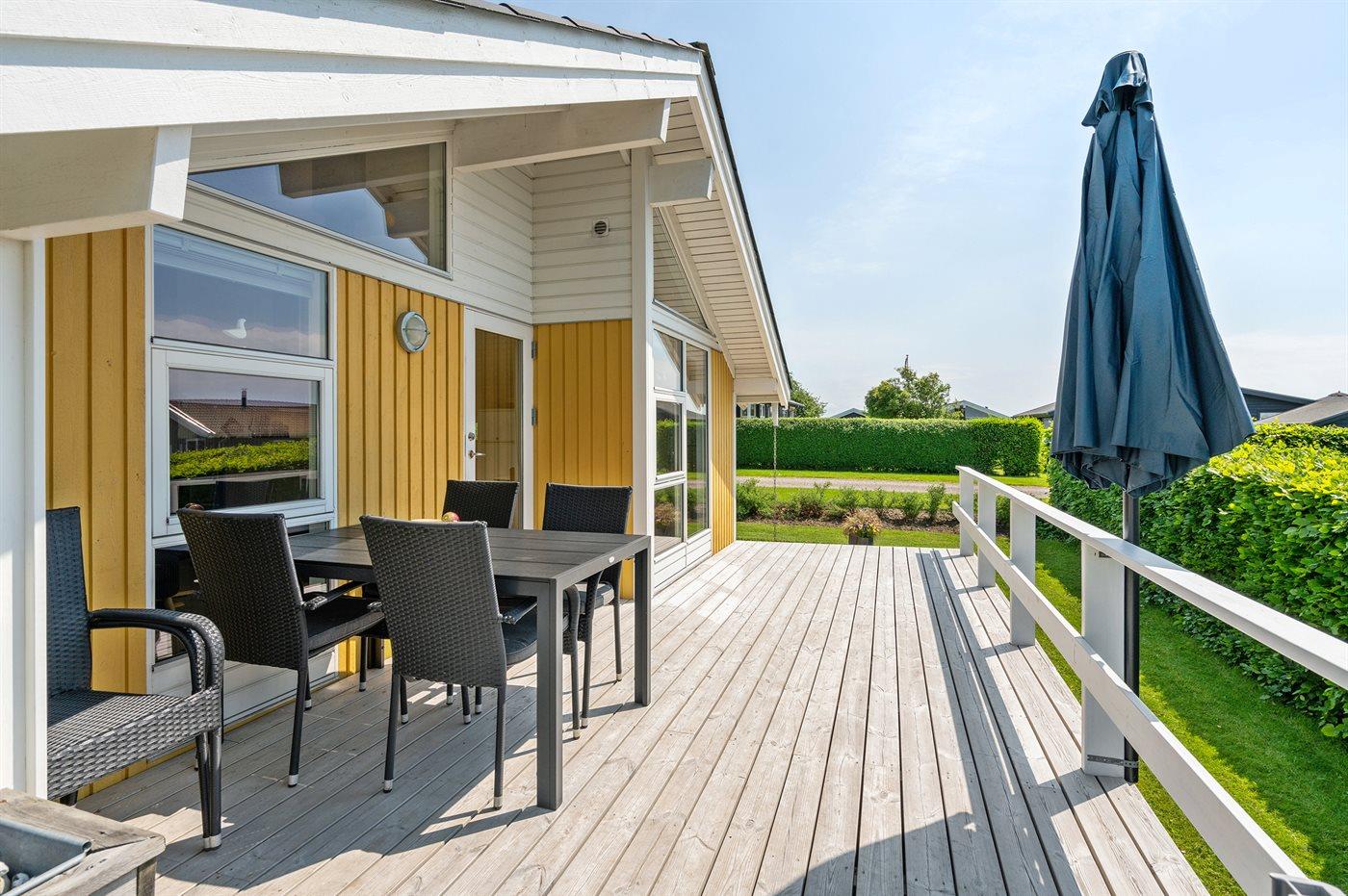 Ferieboligen er beliggende på en 600 m² stor havegrund. Der er 150 m til havet. Nærmeste forretning er beliggende i en afstand af 500 m. Til ferieboligen hører 38 m² terrasseareal. Desuden er der 8 m² overdækket terrasse. Sandkasse. Der ligger en legeplads i en afstand af 300 m. Grill til rådighed. Parkering ved ferieboligen.