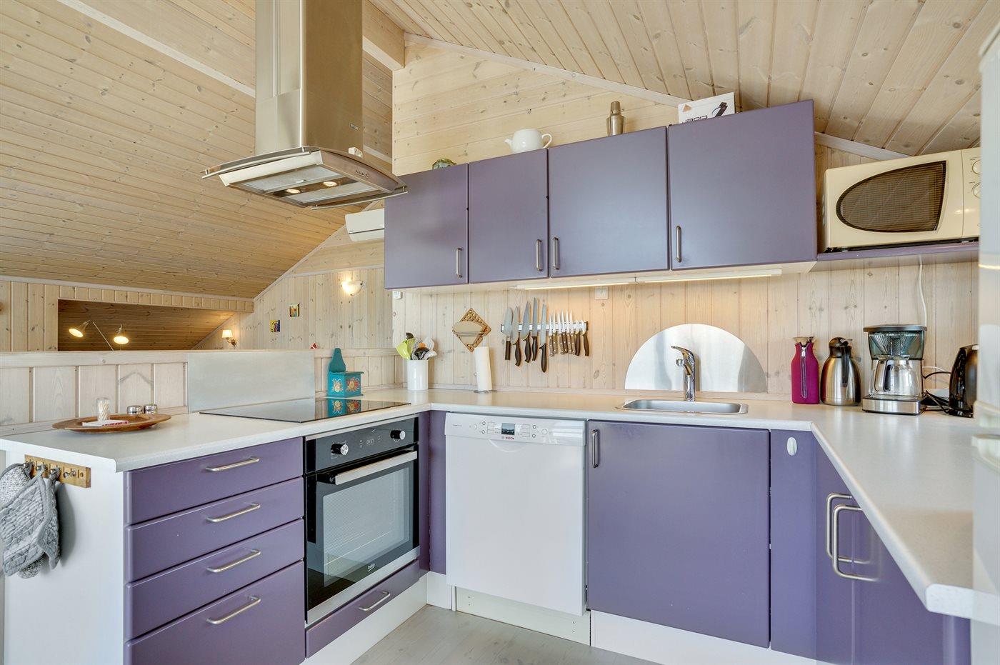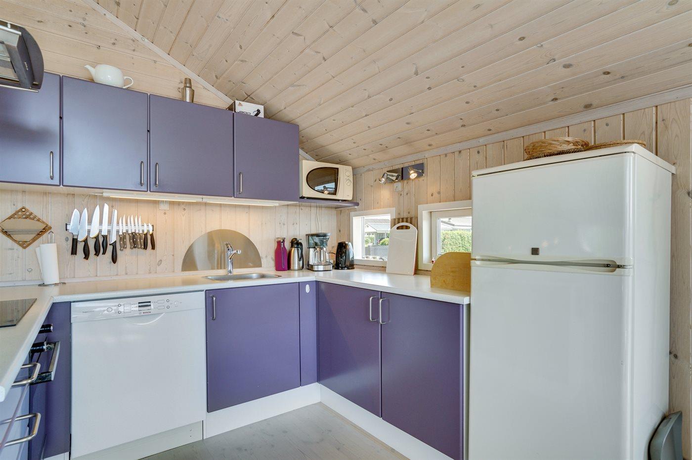 Køkkenet er udstyret med 1 køleskab. Der er 4 keramiske kogeplader, varmluftovn, mikrobølgeovn samt opvaskemaskine.