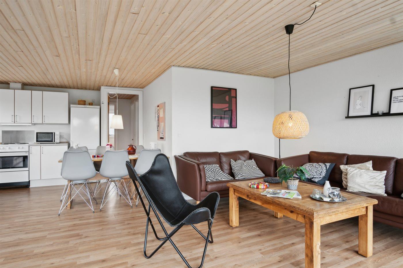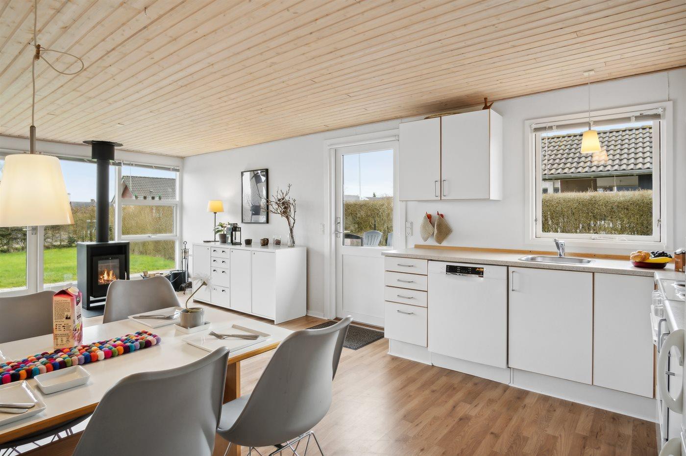 Køkkenet er udstyret med 1 køleskab. Der er 4 elkogeplader, varmluftovn, mikrobølgeovn samt opvaskemaskine.