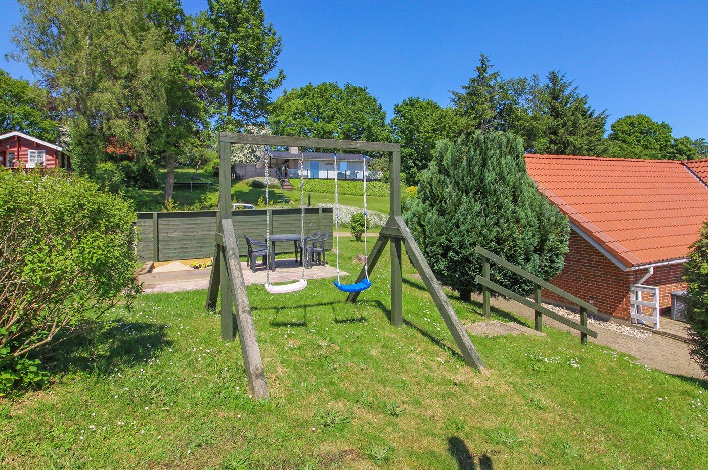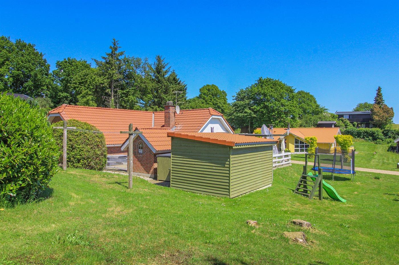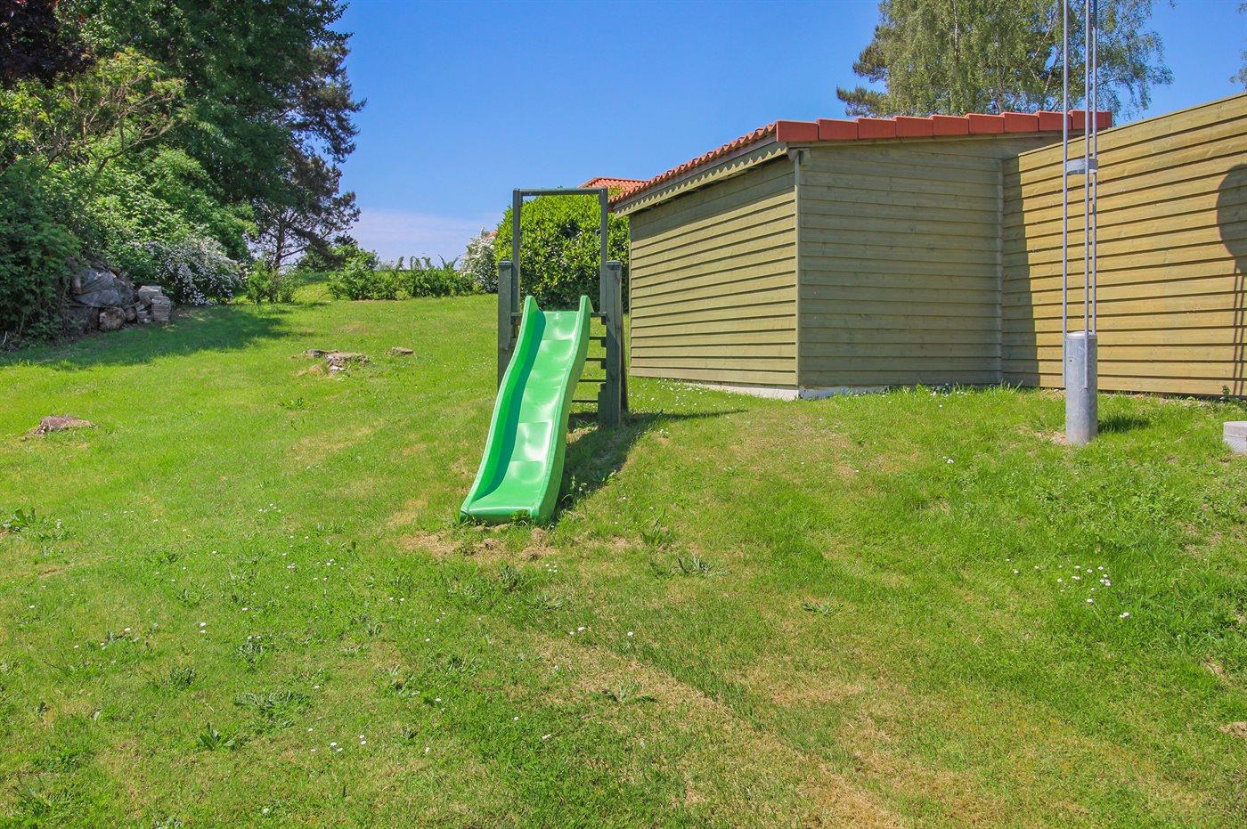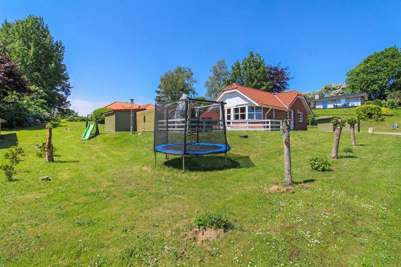 Ferieboligen er beliggende på en 800 m² stor naturgrund. Der er 850 m til havet. Nærmeste forretning er beliggende i en afstand af 3000 m. Til ferieboligen hører 60 m² lukket terrasse. Der er redskabsrum. Gynge. Sandkasse. Trampolin. Rutchebane. Der ligger en legeplads i en afstand af 450 m. Grill til rådighed. Der er installeret stik til opladning af elbil. Parkering ved ferieboligen.