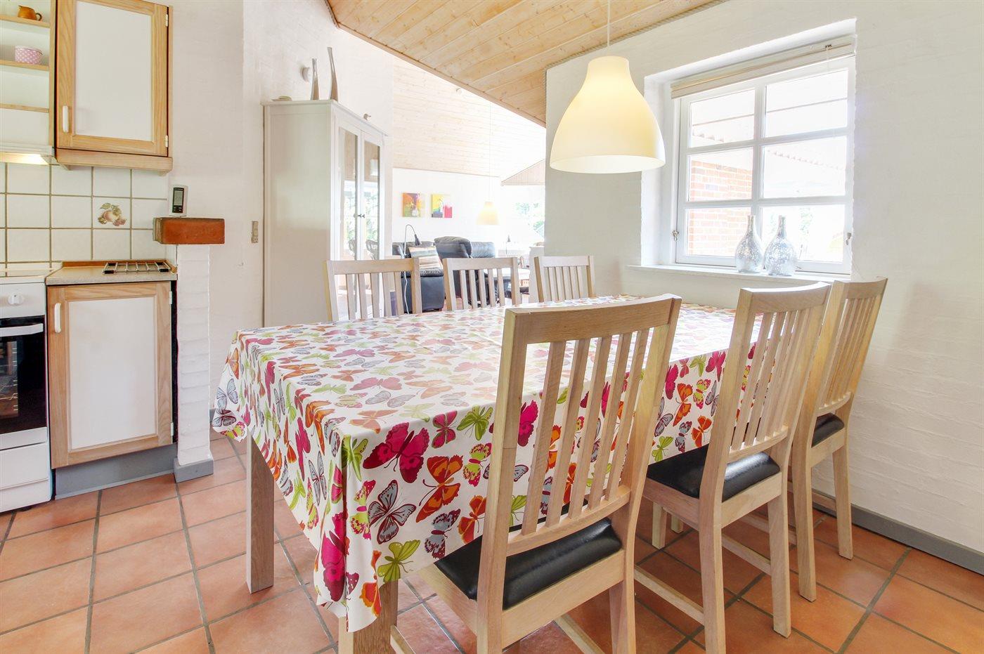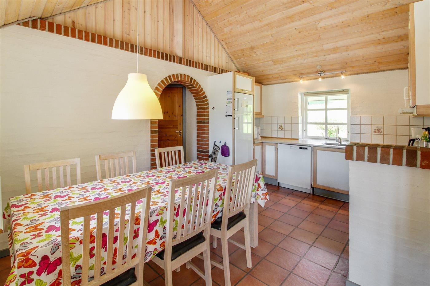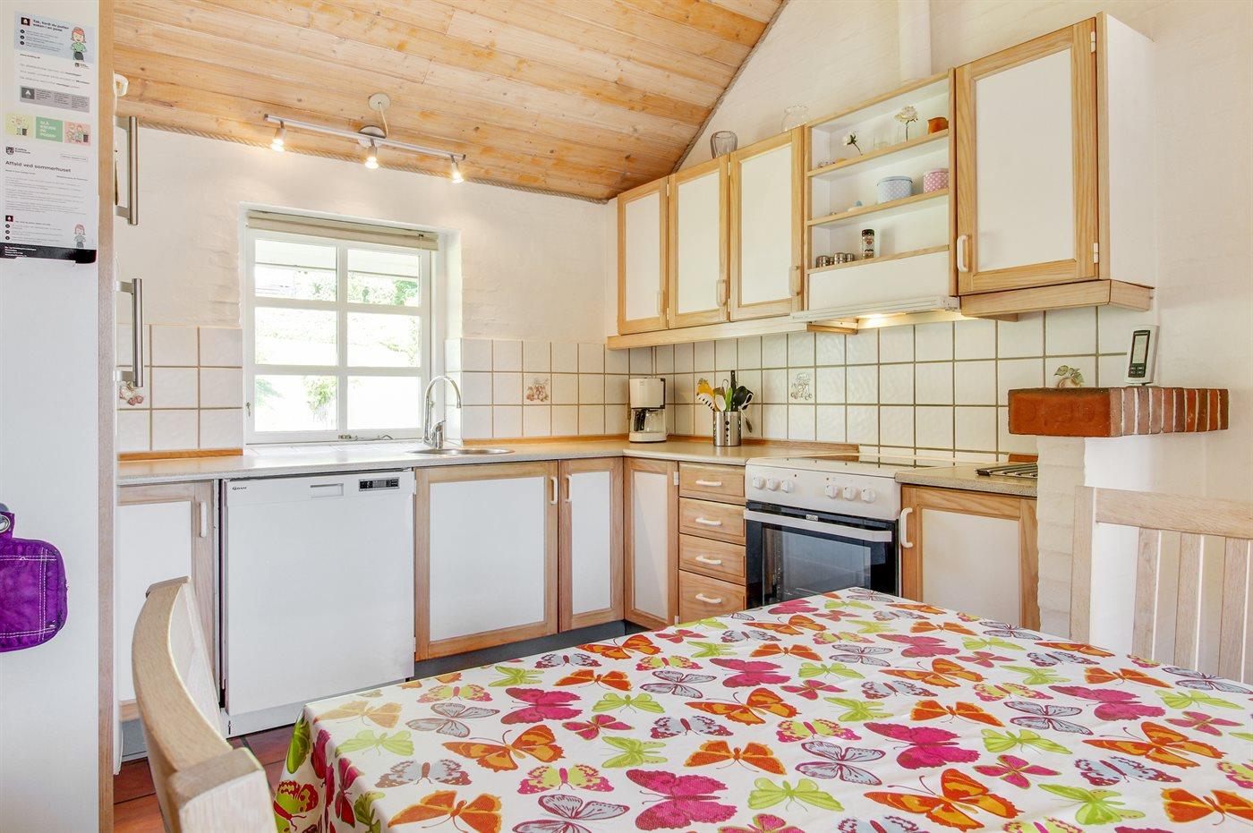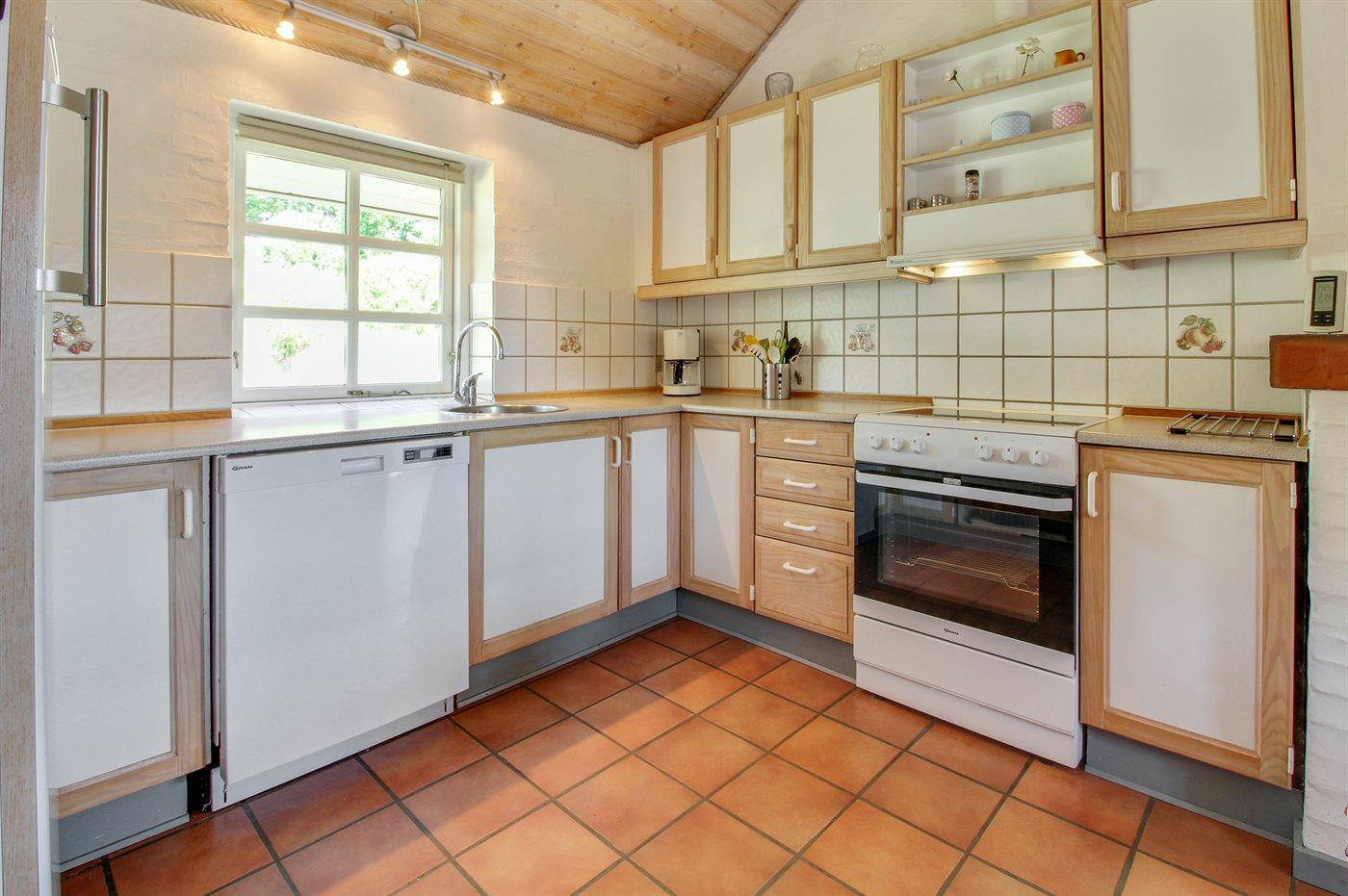 Køkkenet er udstyret med 1 køleskab. Der er 4 keramiske kogeplader, varmluftovn, mikrobølgeovn samt opvaskemaskine Der er gulvvarme i køkkenet.