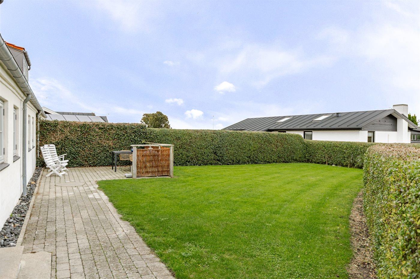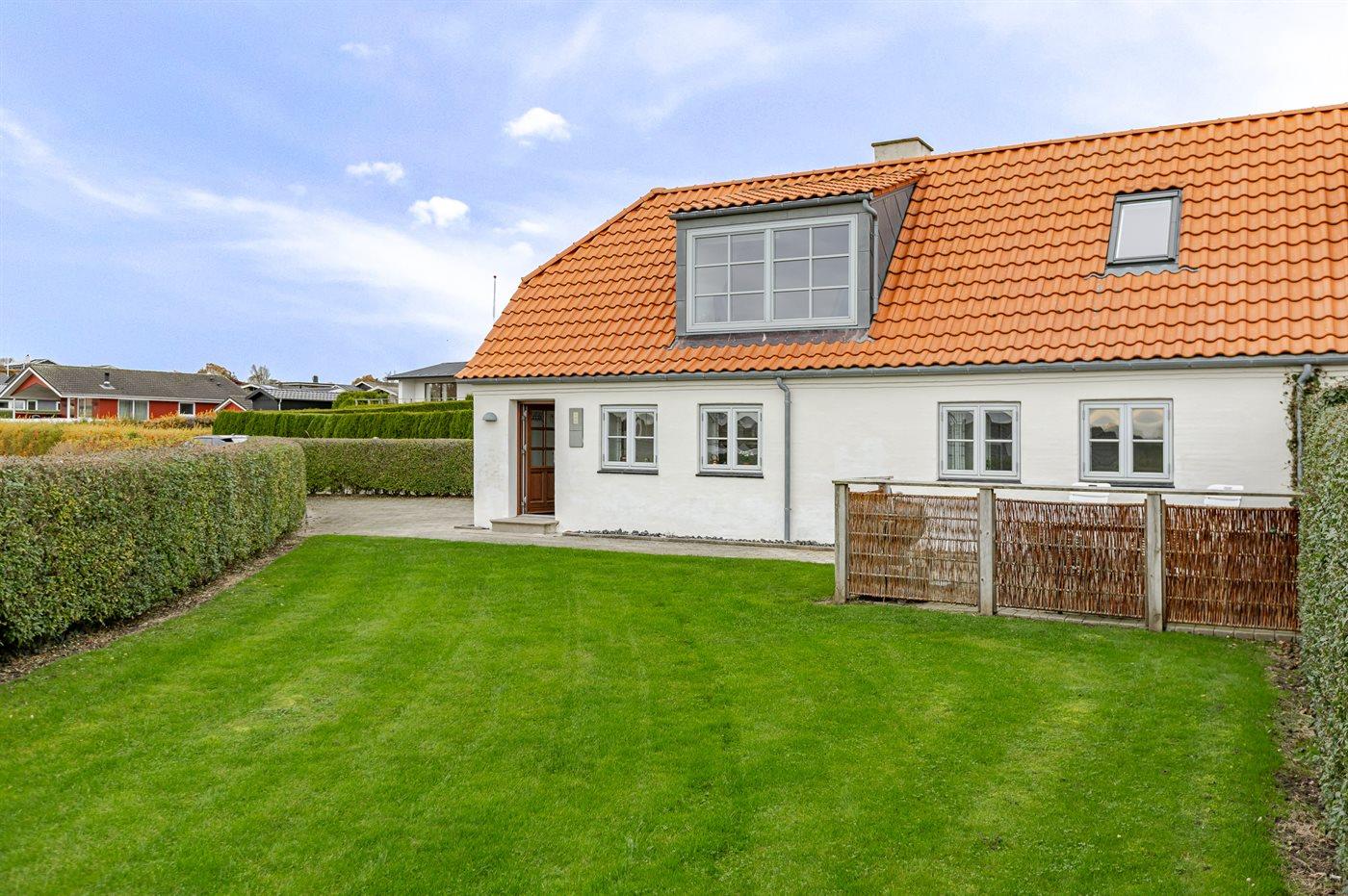 Haven byder på flere hyggelige kroge og en grøn græsplæne, hvor I kan spille bold, nyde solen eller tilberede et lækkert måltid på grillen. For familiens yngste ligger der en legeplads blot cirka 80 meter fra huset, og kun omkring 100 meter derfra finder I stranden – en børnevenlig strand med fint, hvidt sand og gode muligheder for afslappende gåture langs kysten.