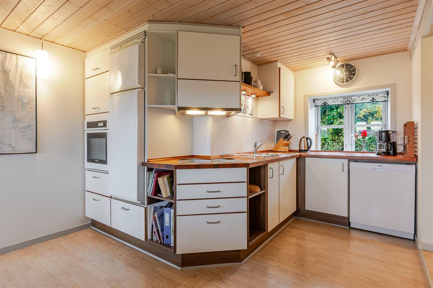 Køkkenet er udstyret med 1 køleskab. Der er 4 keramiske kogeplader, varmluftovn, mikrobølgeovn samt opvaskemaskine.