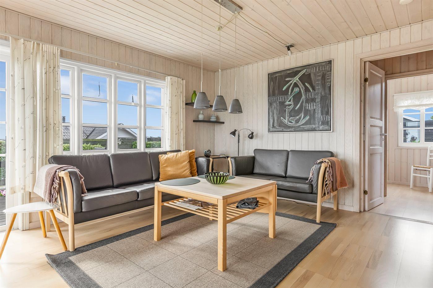 Med dette sommerhus i Hejlsminde får I en feriebolig med en af de absolut bedste udsigter til vandet, udsigten kan nydes både fra stuen og de dejlige terrasseområder ved huset. Den hyggelige stue indbyder til afslapning, og herfra kan I følge havets skiftende stemninger og alt livet på vandet, dette kan I f.eks. også gøre fra spisebordet i stuen.