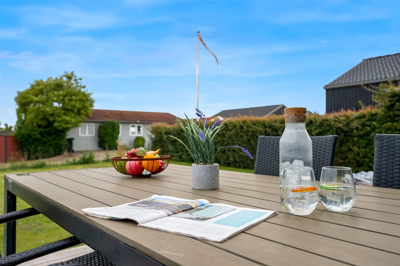 Udelivet omkring huset er noget helt særligt. De store terrasseområder giver mulighed for at nyde solen hele dagen og som nævnt med en dejlig udsigt til vandet. Den store græsplæne giver desuden god plads til boldspil og leg. I råder over flere dejlige havemøbler bl.a. et dejligt loungesæt.