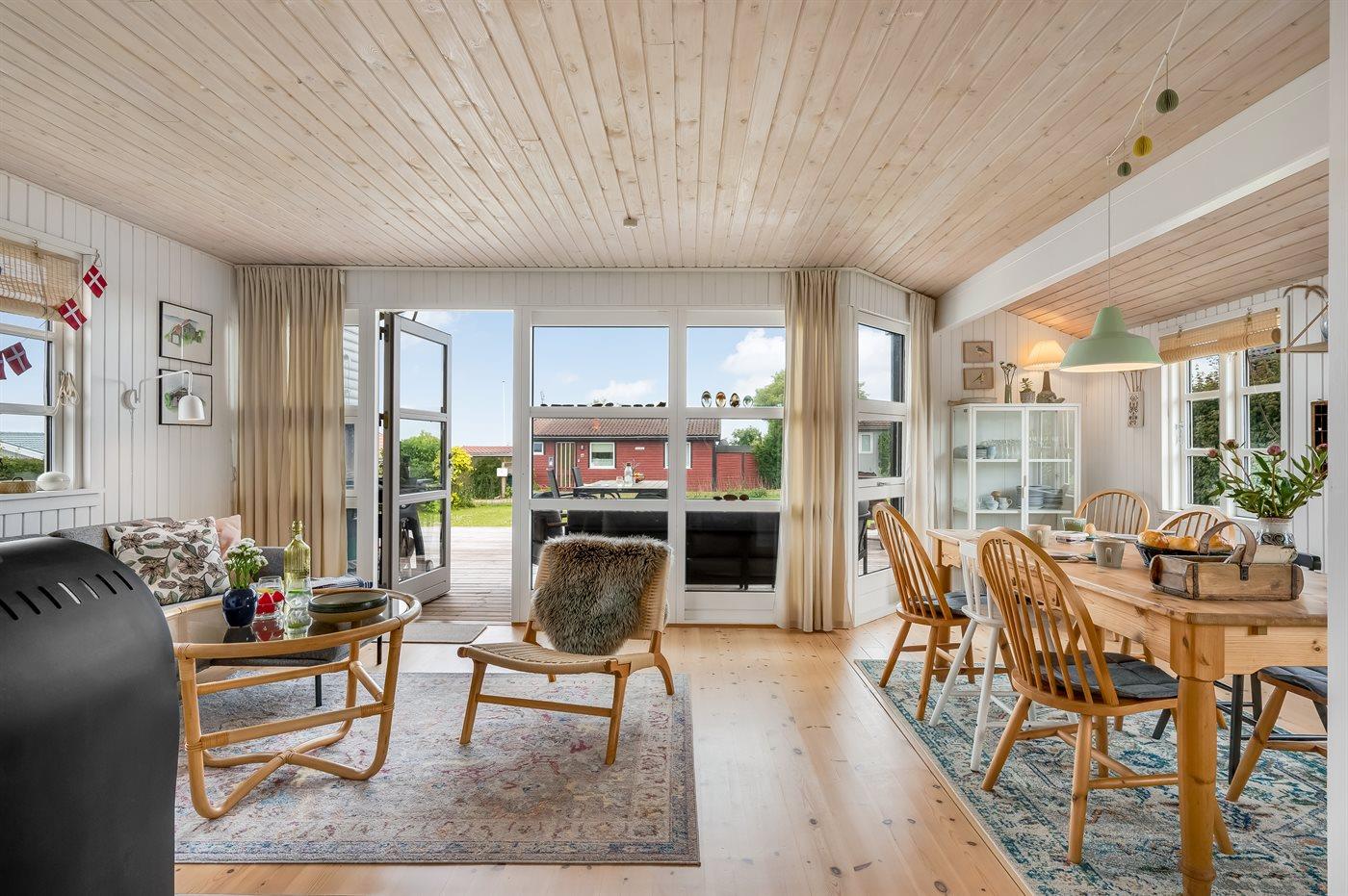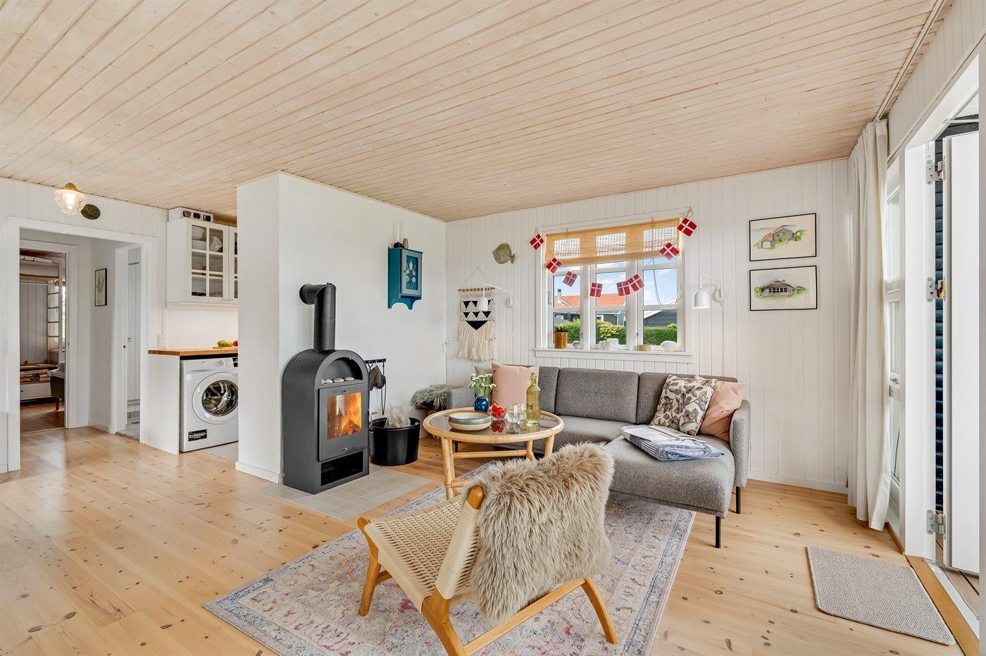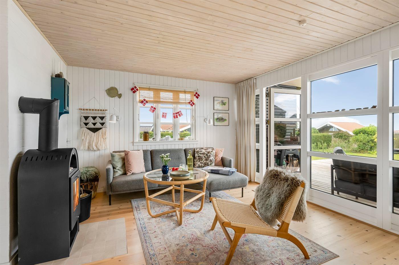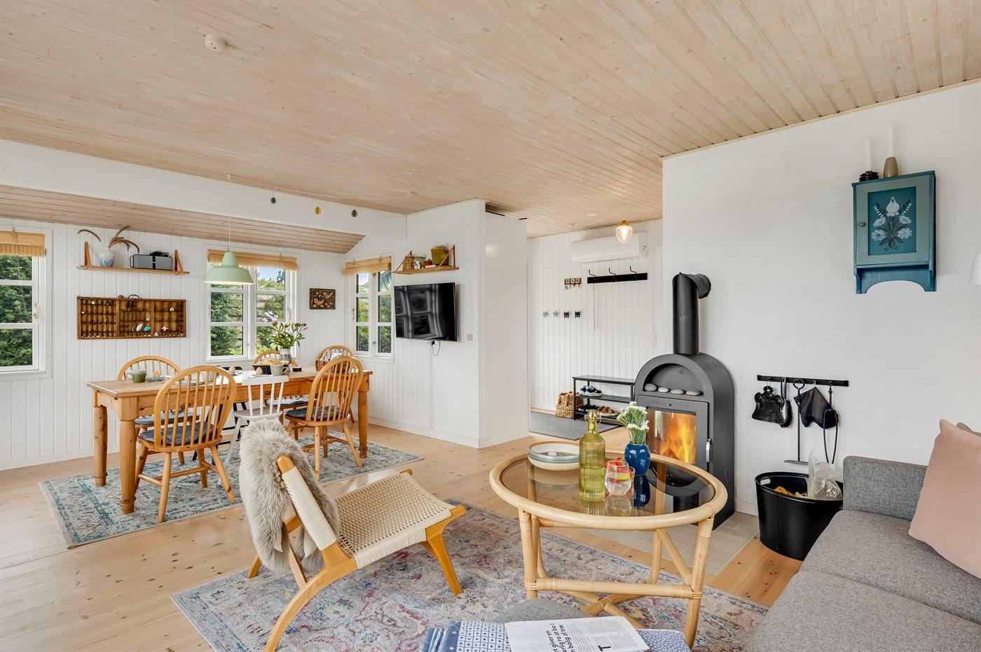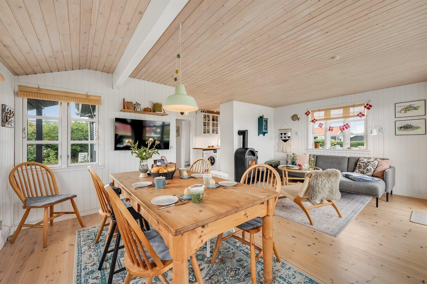 Med dette sommerhus får I en dejlig udsigt til vandet, som kan nydes både fra stuen og den store terrasse. Den hyggelige stue indbyder til afslapning, og herfra kan I følge havets skiftende stemninger, hvad enten I sidder ved spisebordet eller slænger jer i sofaen.