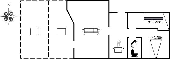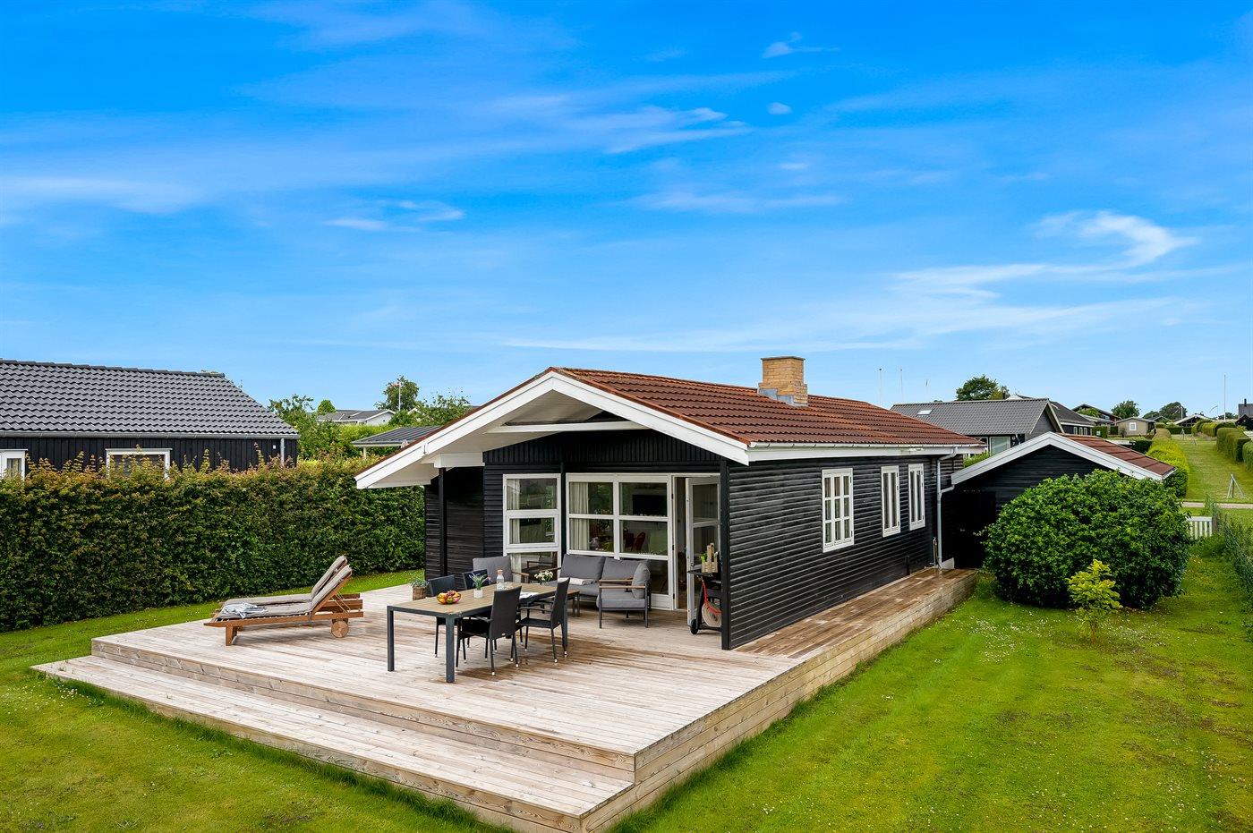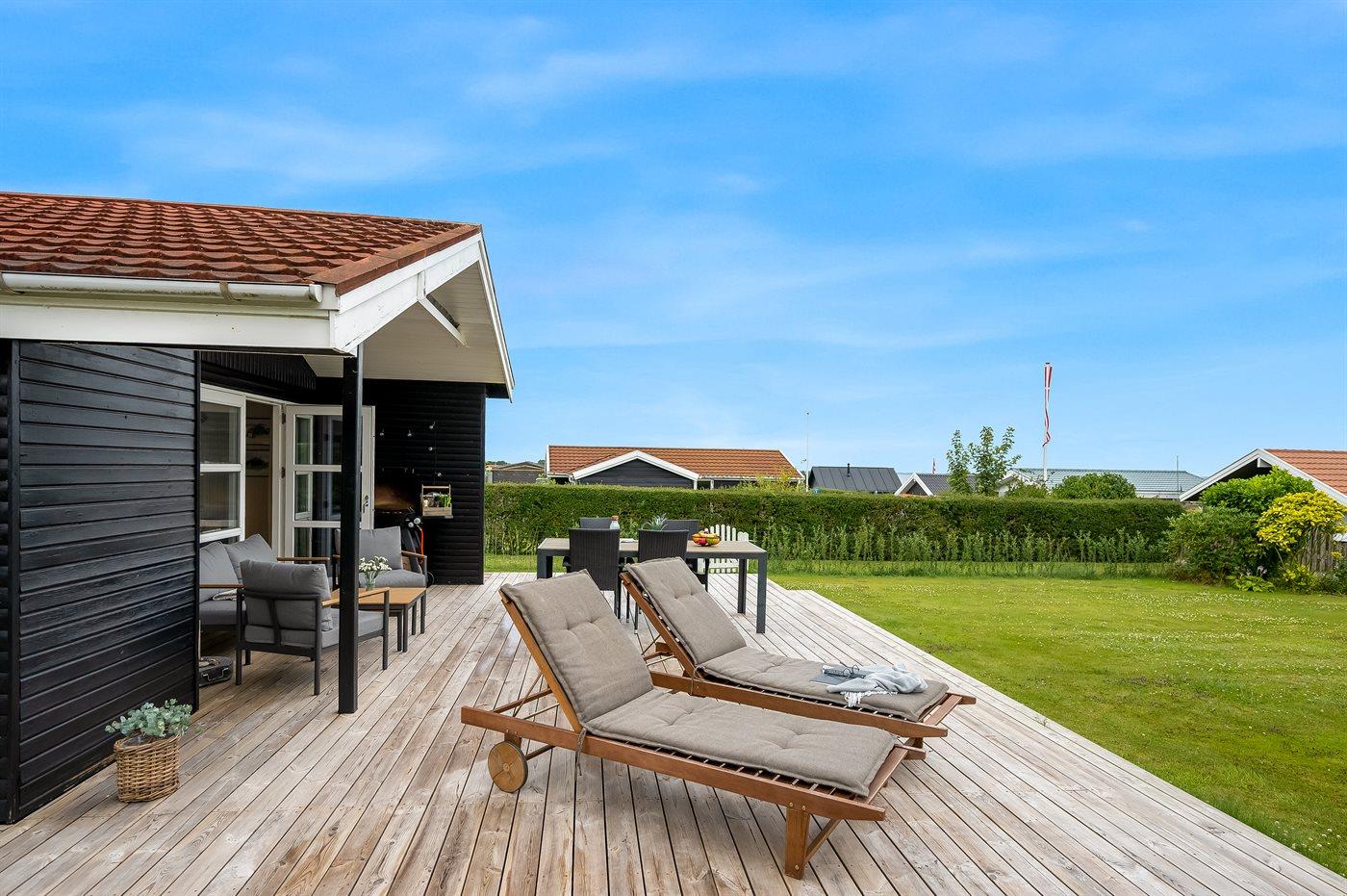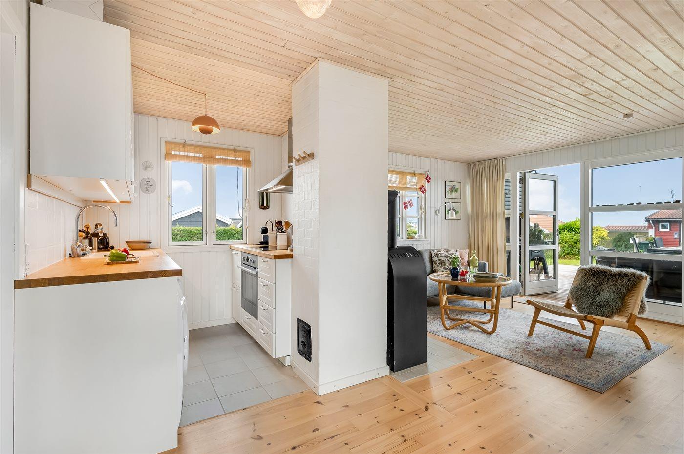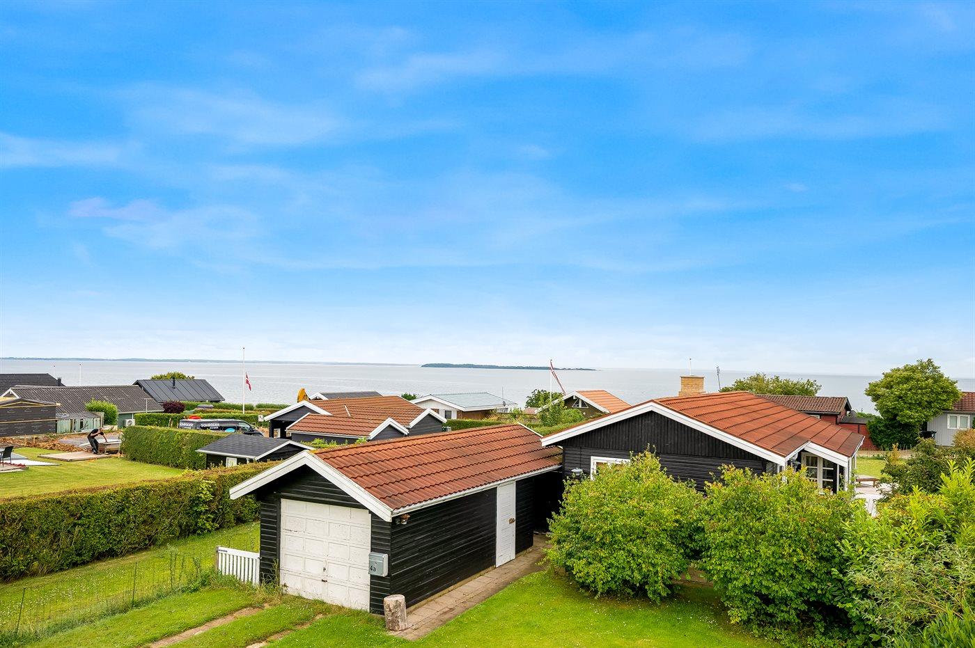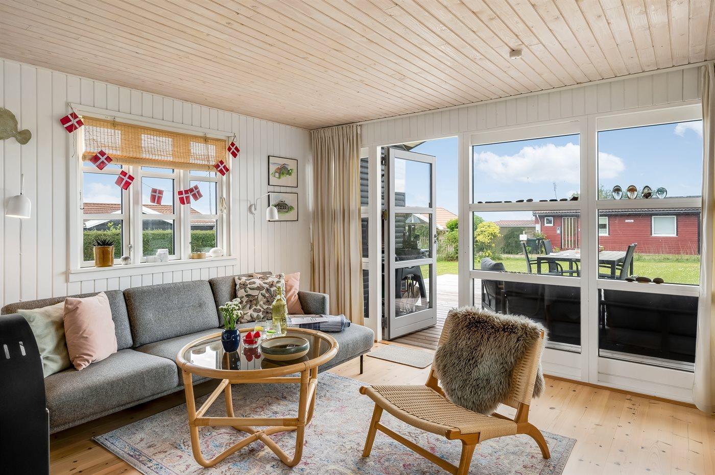 Med dette sommerhus får I en dejlig udsigt til vandet, som kan nydes både fra stuen og den store terrasse. Den hyggelige stue indbyder til afslapning, og herfra kan I følge havets skiftende stemninger, hvad enten I sidder ved spisebordet eller slænger jer i sofaen.