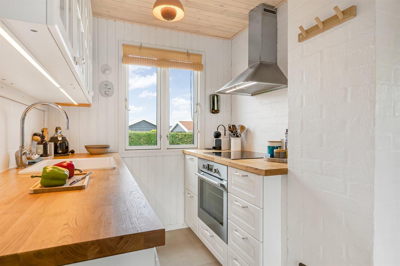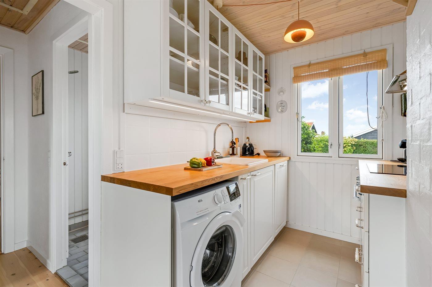 Køkkenet er udstyret med 1 køleskab. Der er 4 induktionskogeplader, varmluftovn, mikrobølgeovn samt opvaskemaskine Der er gulvvarme i køkkenet.