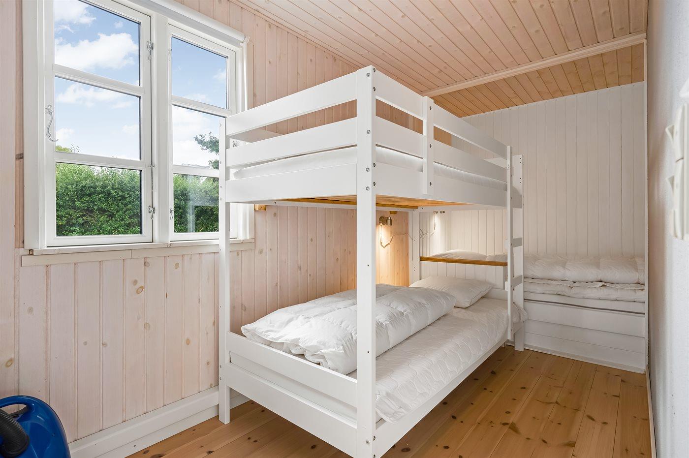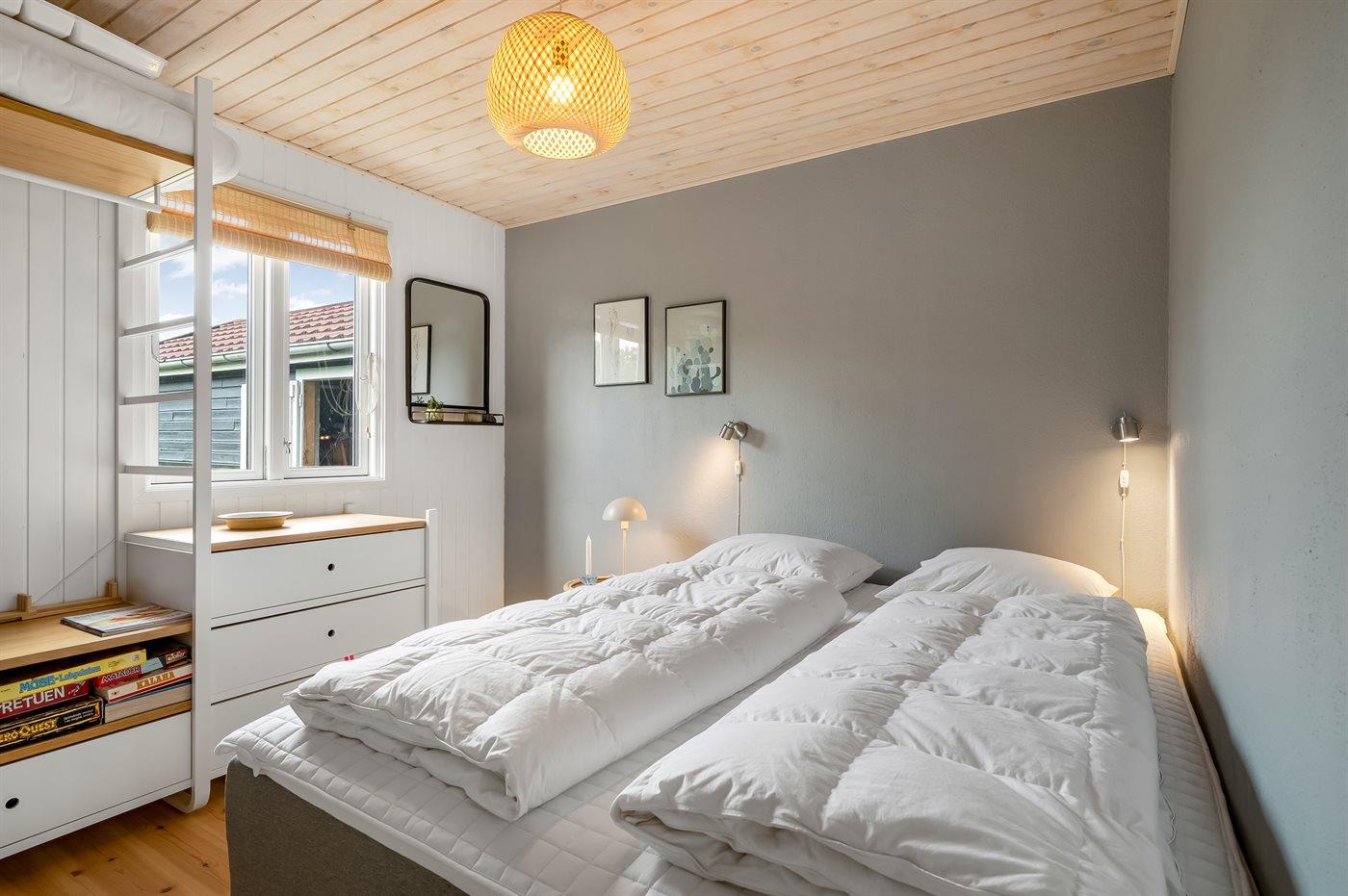 Der er i alt 2 soveværelser. Sovepladserne fordeler sig på: 2 sovepladser i dobbeltseng. 1 soveplads i enkeltseng. 2 sovepladser i køjeseng. Derudover er der 1 stk. barneseng.