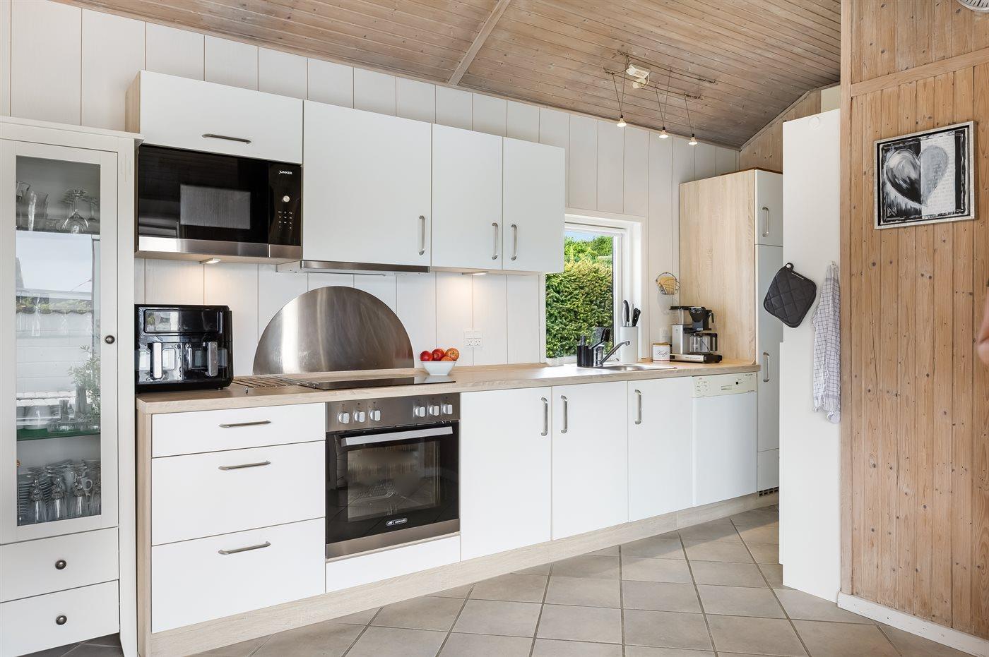 Køkkenet er udstyret med 1 køleskab. Der er 4 keramiske kogeplader, varmluftovn, mikrobølgeovn samt opvaskemaskine Der er gulvvarme i køkkenet.