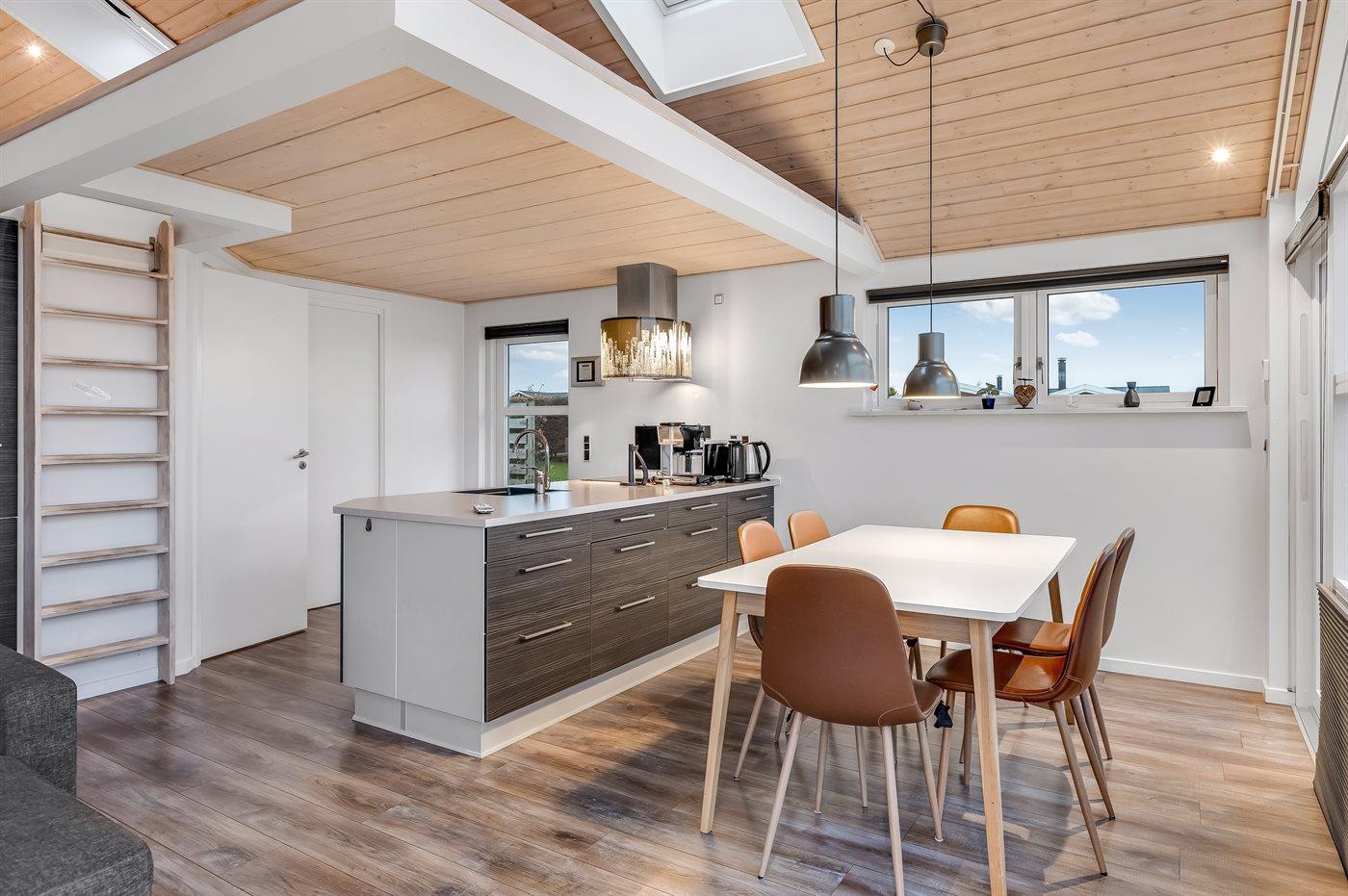 Køkkenet er udstyret med 1 køleskab. Der er 4 induktionskogeplader, varmluftovn, mikrobølgeovn samt opvaskemaskine.