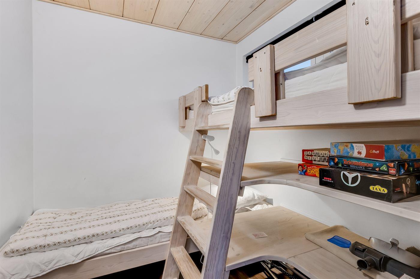 Der er i alt 2 soveværelser. Sovepladserne fordeler sig på: 1 soveplads i enkeltseng.1 soveplads i køjeseng.2 sovepladser i elevationssenge. 1 soveplads i sovesofa (enkelt). 2 af disse sovepladser befinder sig i stuen. Derudover er der 1 stk. barneseng.