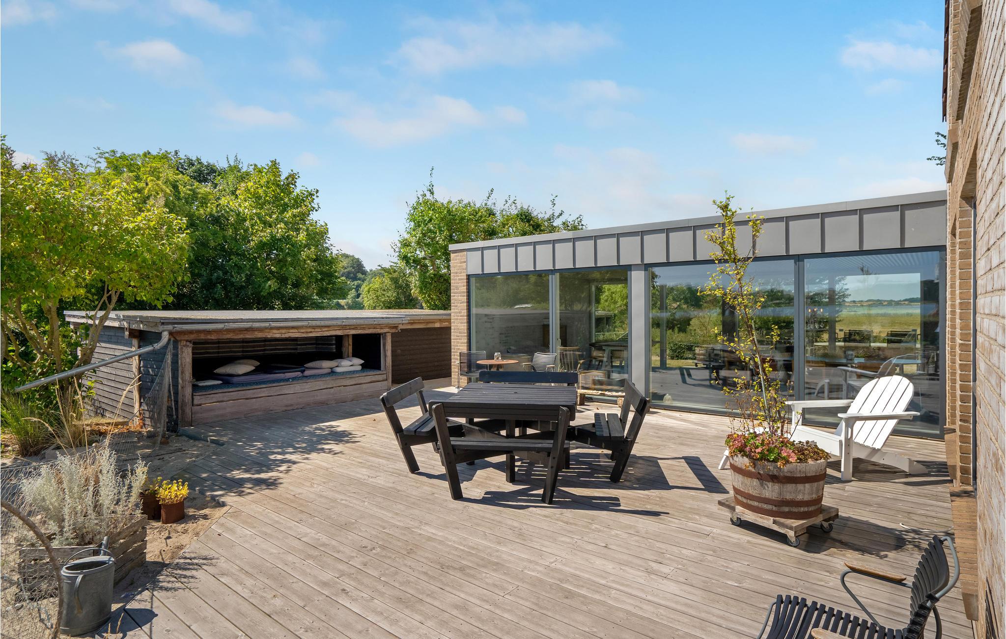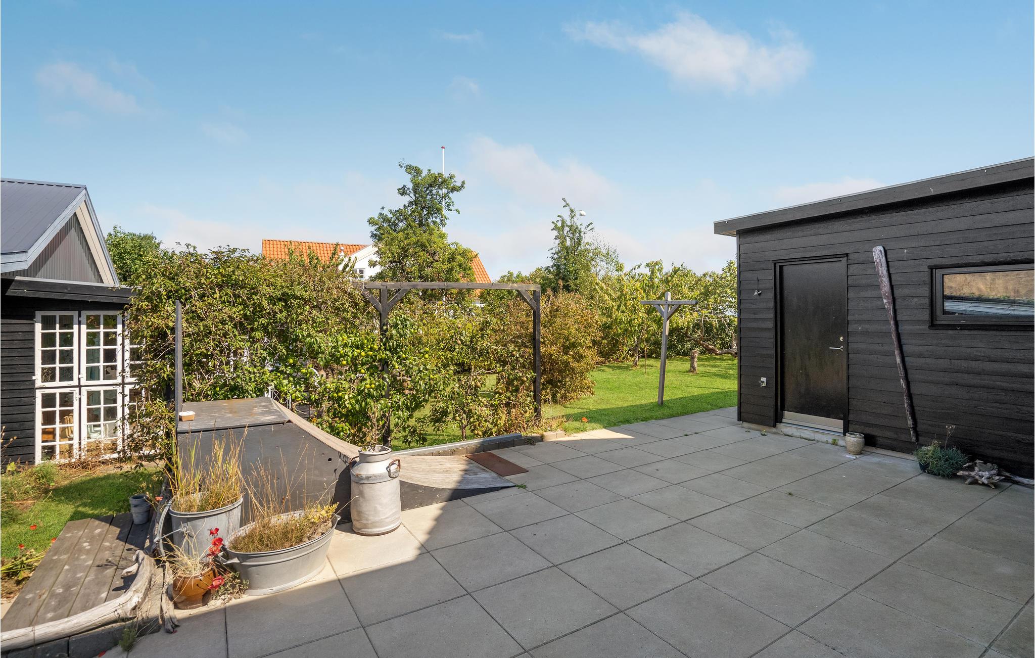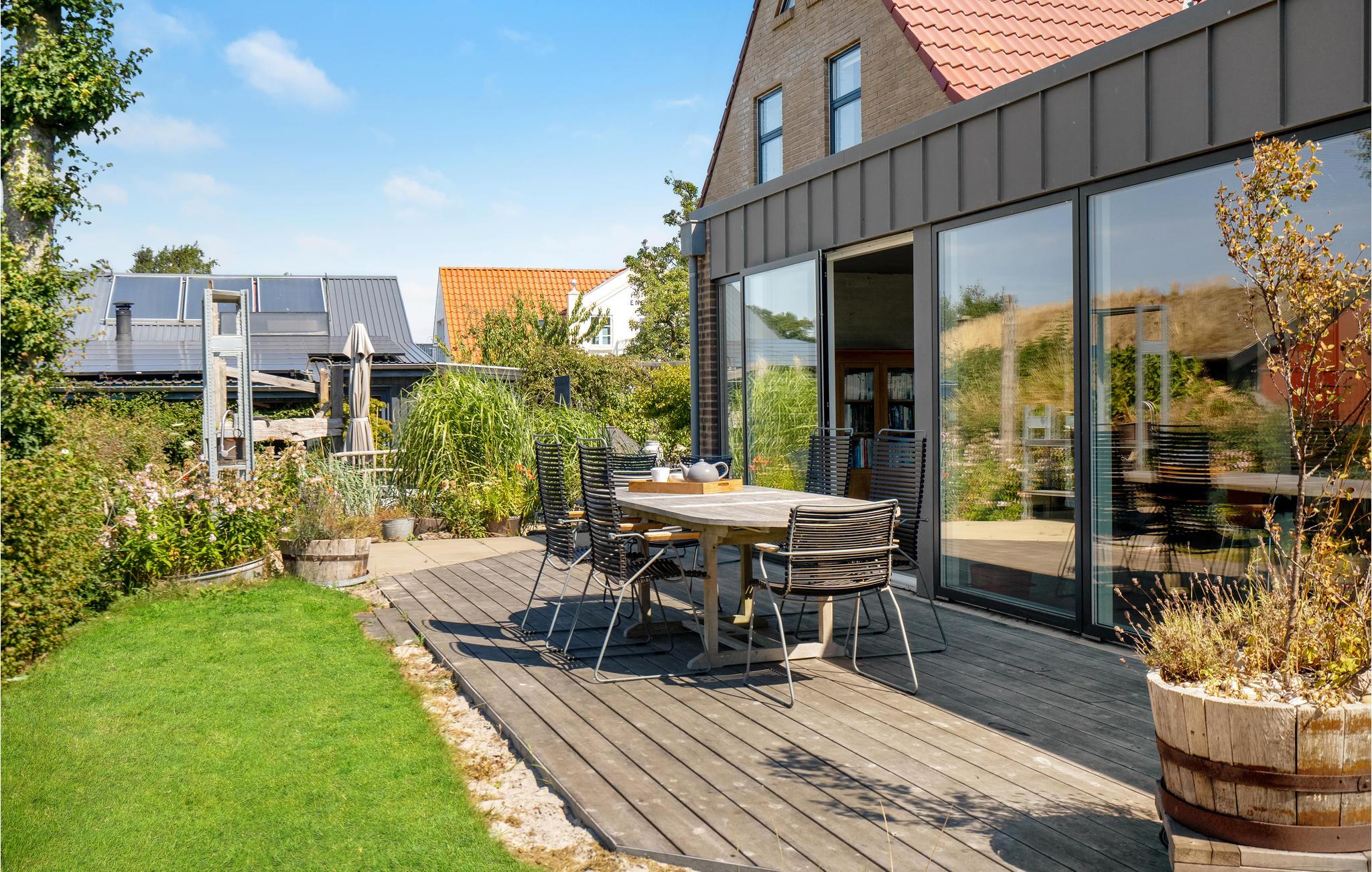 Til huset hører en stor terrasse og have med adskillige møbler til solbadning og udendørsspisning. Børnene vil elske at løbe rundt og lege på græsset, og hele familien kan spille fodbold, badminton og volleyball. I har selvfølgelig også grill til rådighed, så I kan samles til hyggelige grillaftener. Derudover er der bålplads til snobrødsbagning eller hyggesnak sent om aftenen, mens flammerne lyser op i mørket.