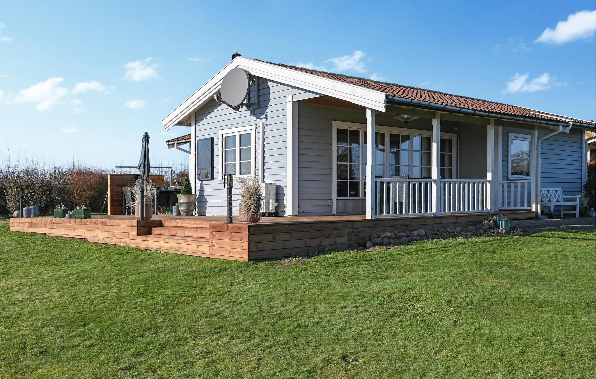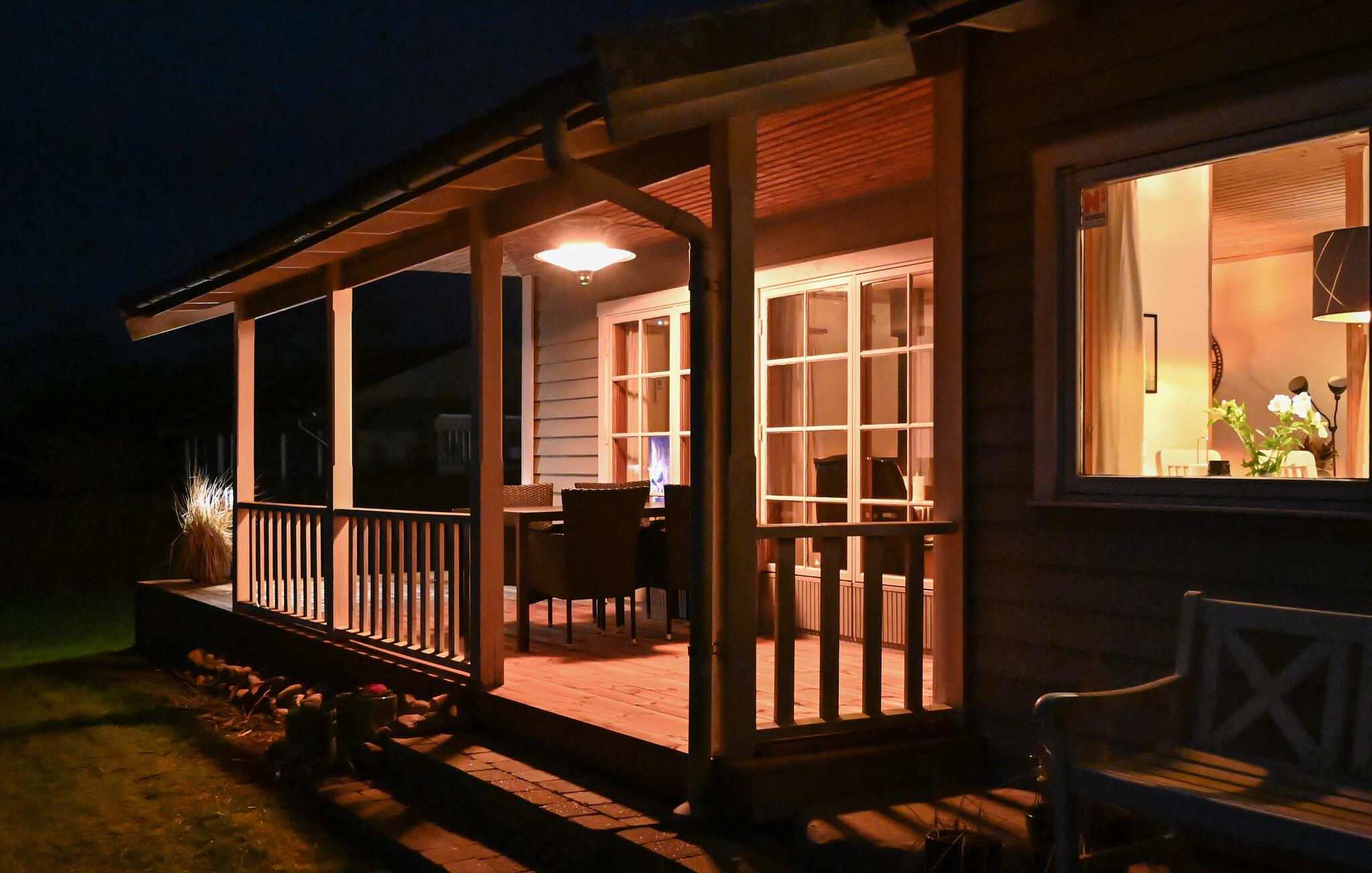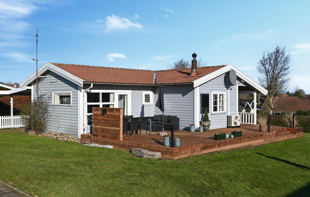 Hyggeligt træferiehus i Hejlsminde med overdækket terrasse og smuk udsigt over feriehusområdet.