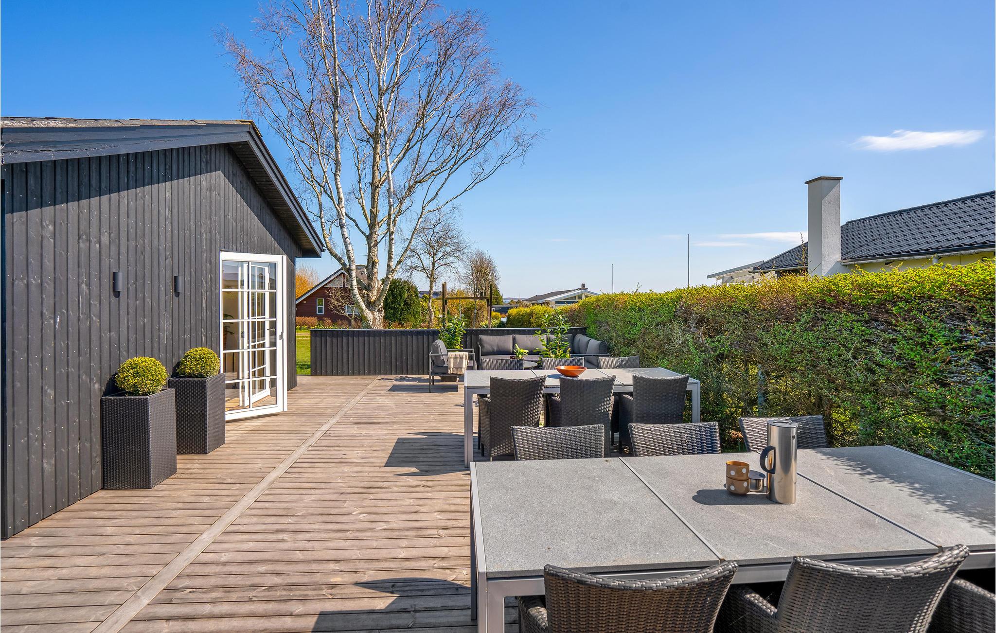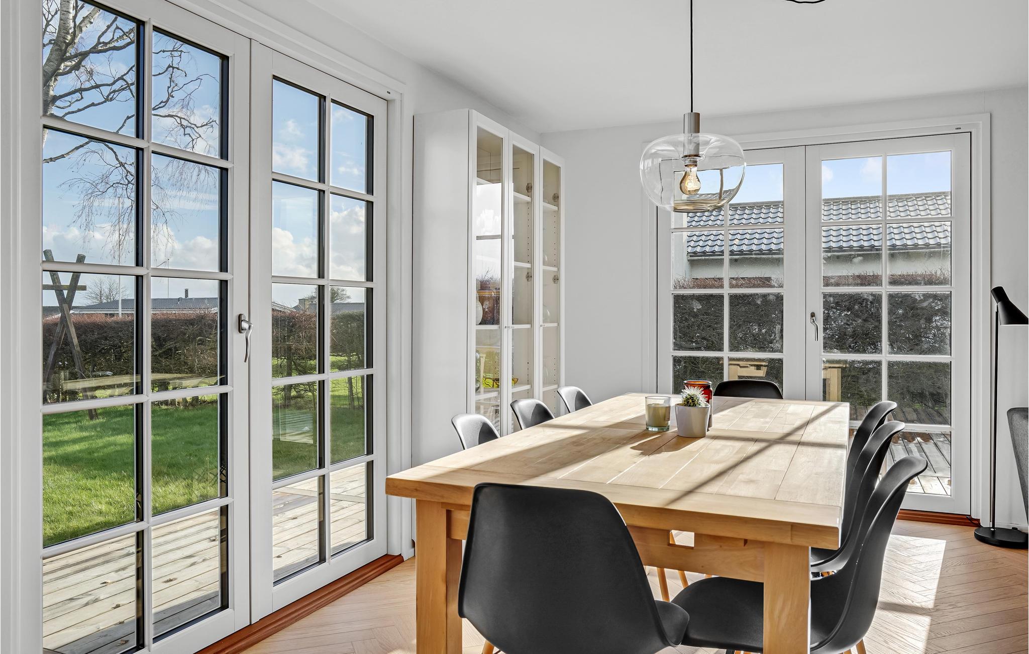 Der er direkte udgang både fra stuen og fra spisepladsen til en stor terrasse med sol hele dagen. Udenfor kan I slappe af i loungemøblerne og grille og lave mad i udekøkkenet. Haven indbyder til afslapning og hygge ved bålstedet og børnene kan lege i legehuset og sandkassen eller spille fodbold på græsplænen.