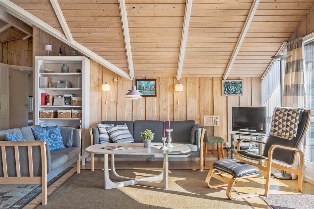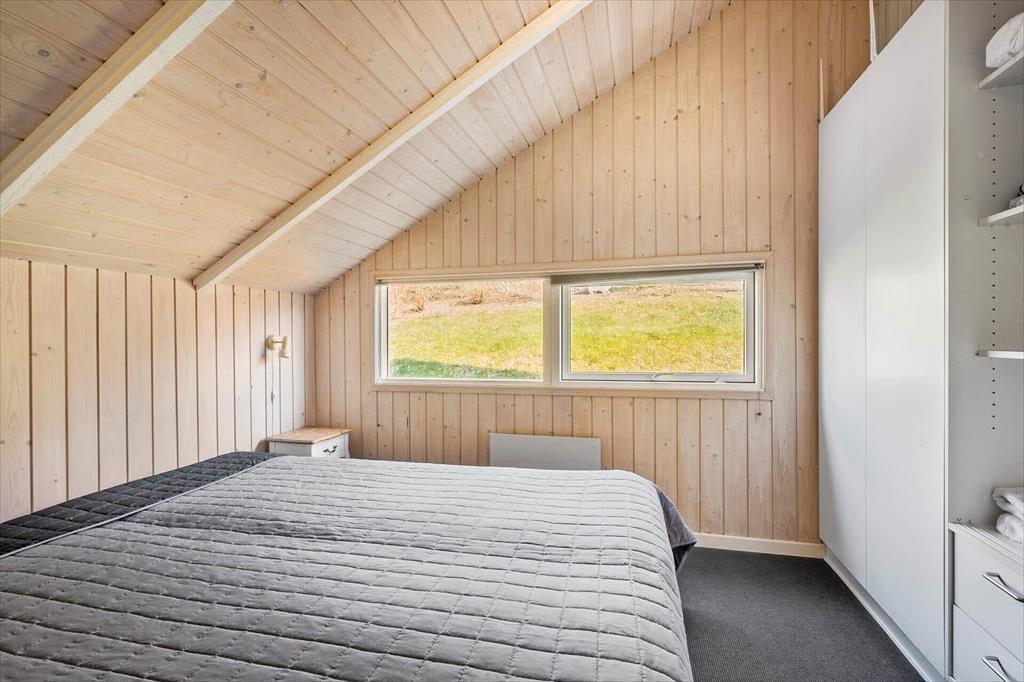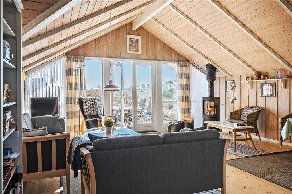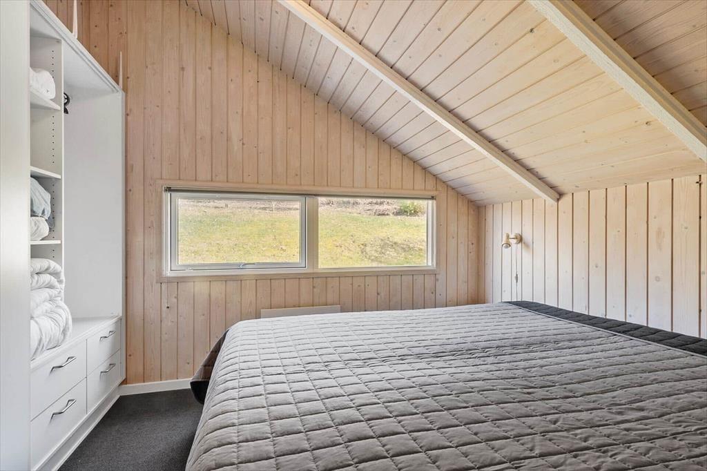 Sommerhuset emmer af lys og luftighed, når du træder indenfor. I stuen strømmer dagslyset ind gennem de store vinduespartier og skaber et varmt og indbydende rum, hvor loft til kip giver en dejlig rummelighed. Her kan du finde dig godt til rette i sofaen med udsigt til haven, mens du nyder stilheden og samværet med dem, du holder af. Køkkenet ligger i åben forbindelse med stuen og danner en naturlig ramme om feriens måltider og hyggelige stunder ved spisebordet. Når dagen går på hæld, kan du trække dig tilbage til de rolige værelser, der alle er indrettet med fokus på komfort og afslapning.