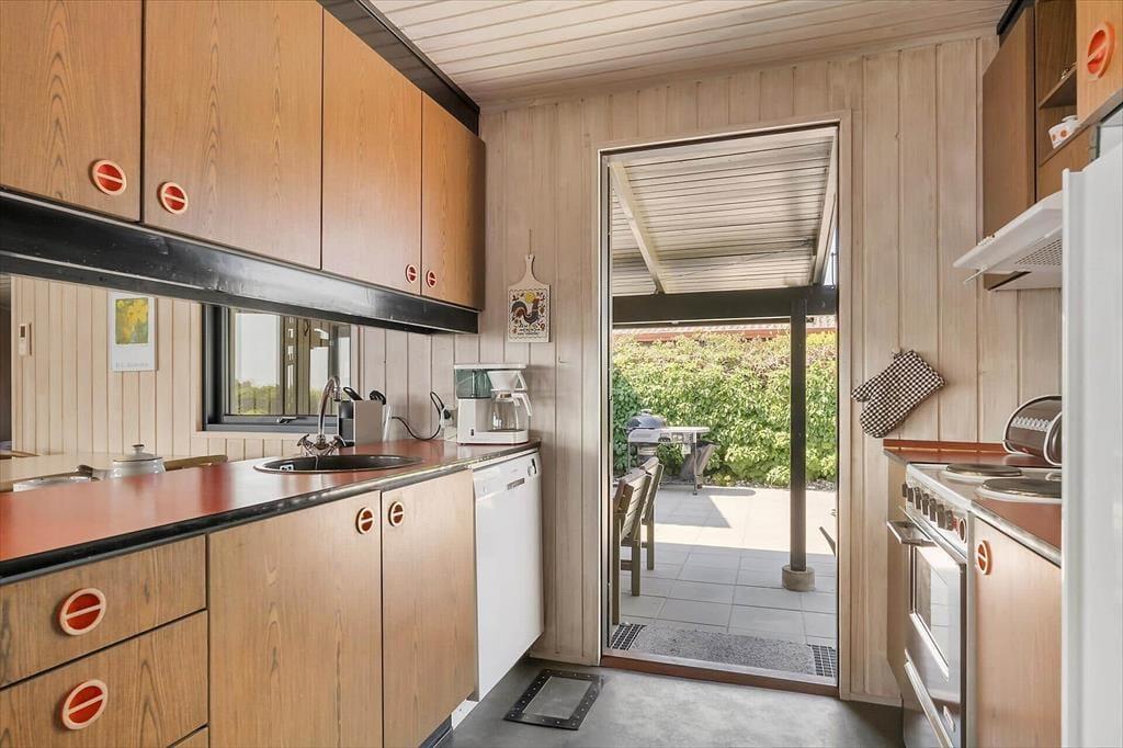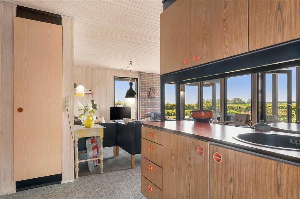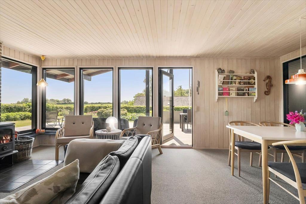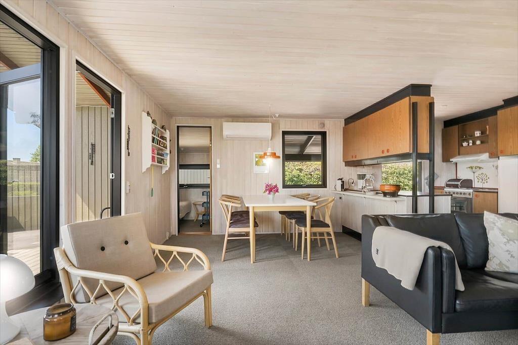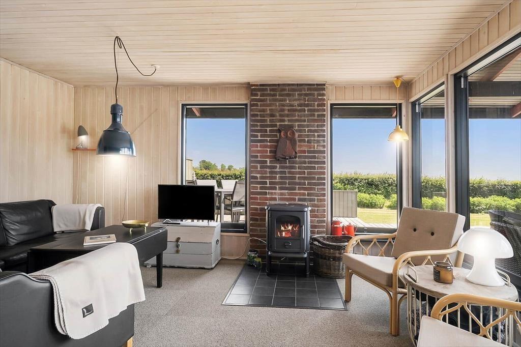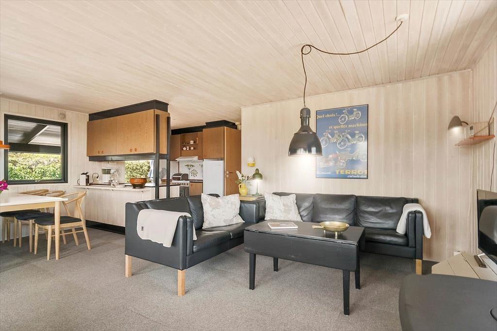 Sommerhuset emmer af klassisk sommerhusstemning med sin autentiske og hyggelige indretning. De varme trævægge, de store vinduespartier og de nøje udvalgte detaljer skaber en lys og indbydende atmosfære. I opholdsrummet forenes stue, spiseplads og køkken i ét, hvilket skaber en hyggelig ramme for feriens mange stunder med god mad, brætspil og lange samtaler. Brændeovnen tilføjer ekstra varme og charme til de kølige aftener, hvor du kan synke ned i sofaen med en god bog.