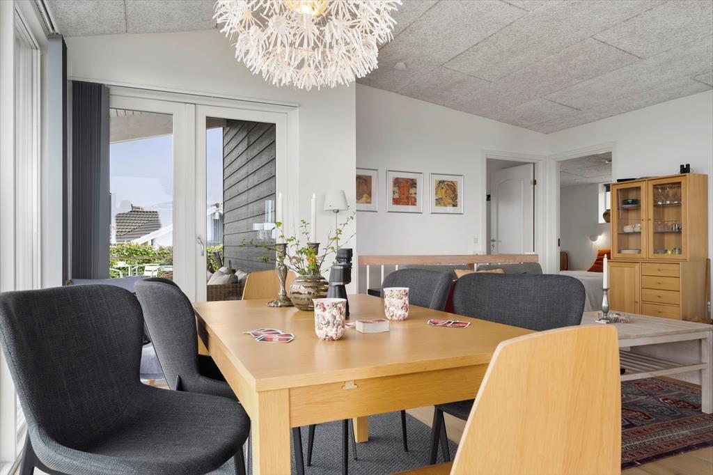 Udendørs er der lagt op til lange, lyse dage og hyggelige aftener i det fri. Sommerhuset er omgivet af store, indbydende terrasser – både åbne og overdækkede – så du altid kan finde en solplet eller søge skygge, alt efter hvad dagen og vejret kalder på. Terrasserne lægger op til morgenmad i solen, eftermiddagskaffe med udsigt og aftensmad fra grillen under åben himmel. Den omkringliggende natur inviterer til leg, afslapning og fordybelse – og med en offentlig legeplads i kort gåafstand er der også tænkt på familiens yngste. Her kan børnene brænde krudt af, mens de voksne nyder udsigten og den friske havluft. De mange små kroge og læ hjørner gør det let at finde sin egen favoritplads udenfor.