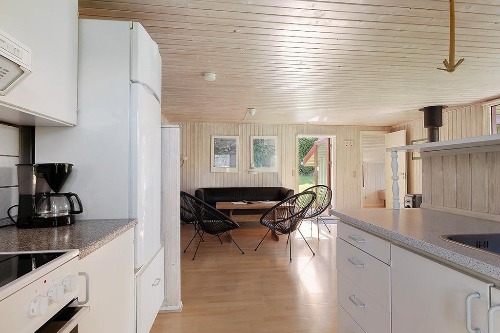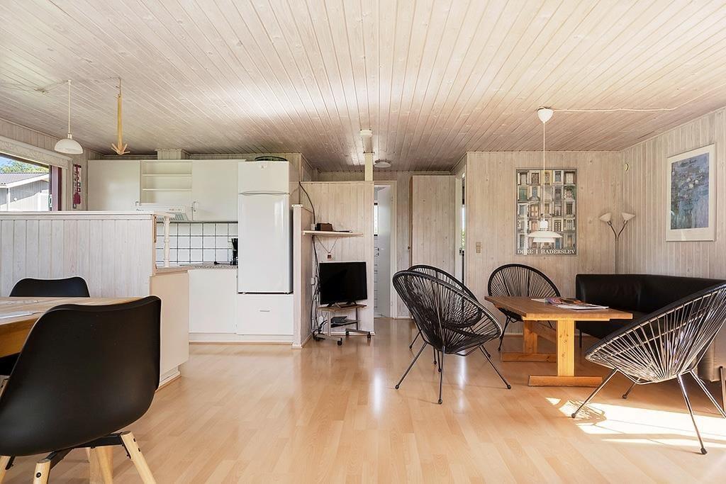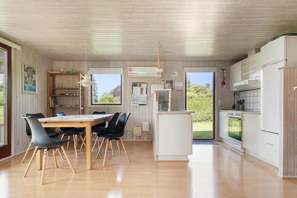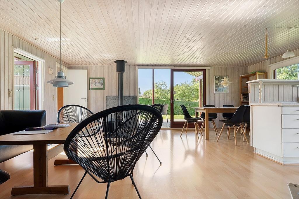 Når du træder ind i sommerhuset på Poppelvænget 4 i Hejlsminde, mødes du straks af en varm og indbydende stemning. Indretningen er hyggelig og hjemlig – så du og dine nærmeste straks føler jer godt tilpas. Det åbne opholdsrum er det naturlige samlingspunkt i huset, hvor stue og køkken flyder sammen i ét og skaber rammerne for nærvær, fællesskab og ro. Gennem de store vinduer strømmer dagslyset ind og åbner for udsigten til haven, som indbyder til ro og fordybelse. Her kan du læne dig tilbage, læse en god bog eller nyde et glas vin i sofaen, mens børnene leger på gulvet.