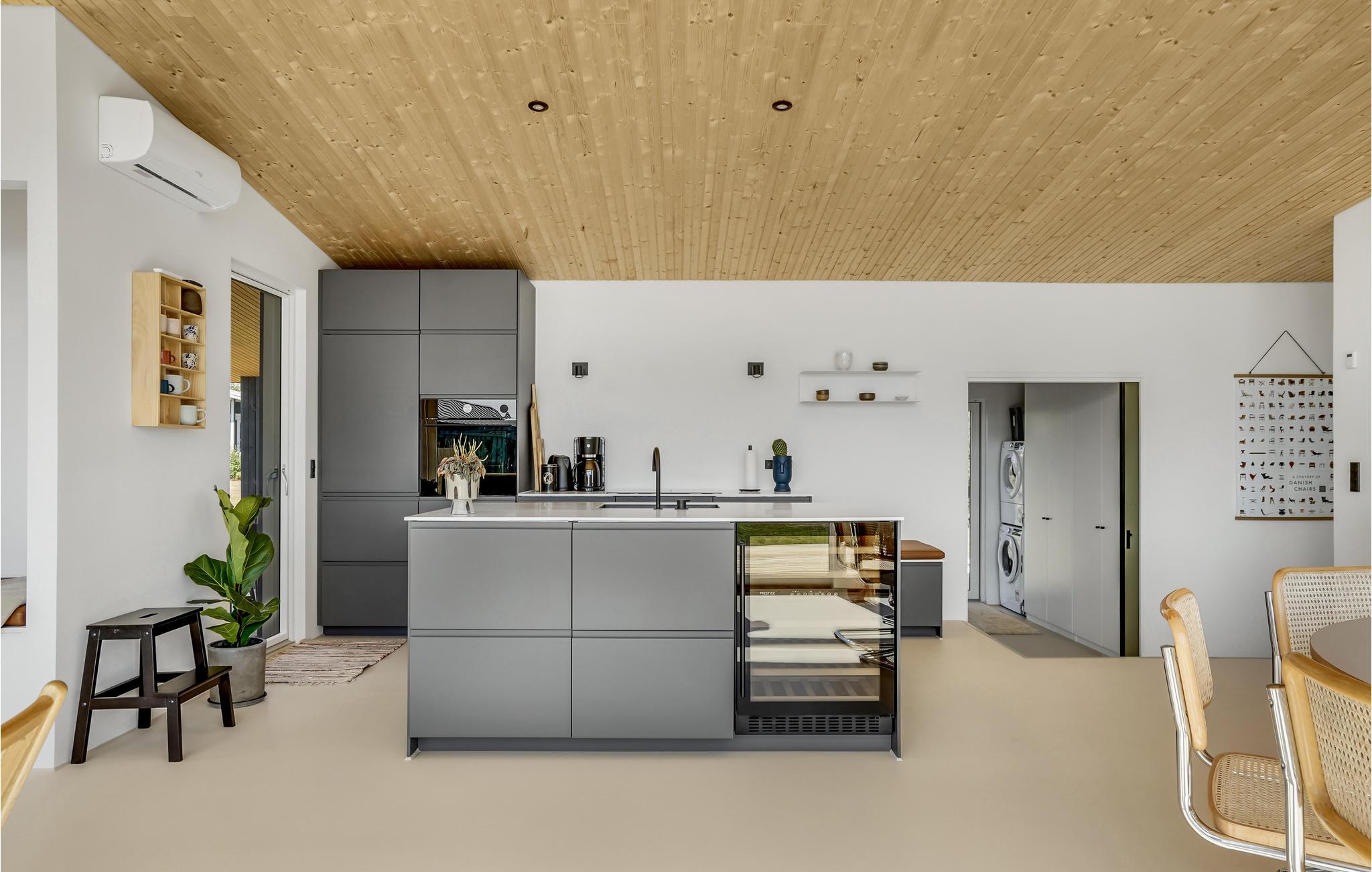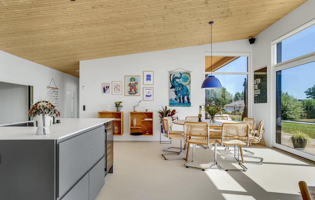 Tag familien med til dette gennemførte sommerhus i Hejsager, som ligger charmerende placeret med udsigt til Sandvigbugtens rolige vand. De store vinduespartier lukker masser af lys ind i boligen, så rummene emmer af ro og har et helt særligt harmonisk udtryk. Sæt sommersalaten sammen i det strømlinede køkken og tænd op i grillen på terrassen. Efter en lang dag med mange oplevelser, kan I sætte jer til rette i spabadet og løsne op i musklerne.