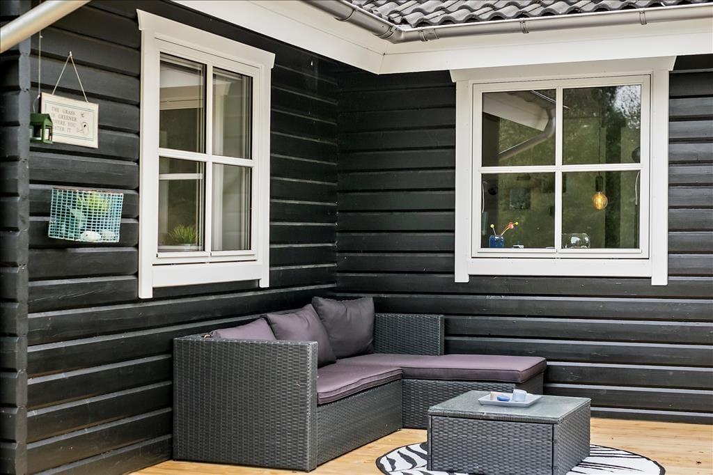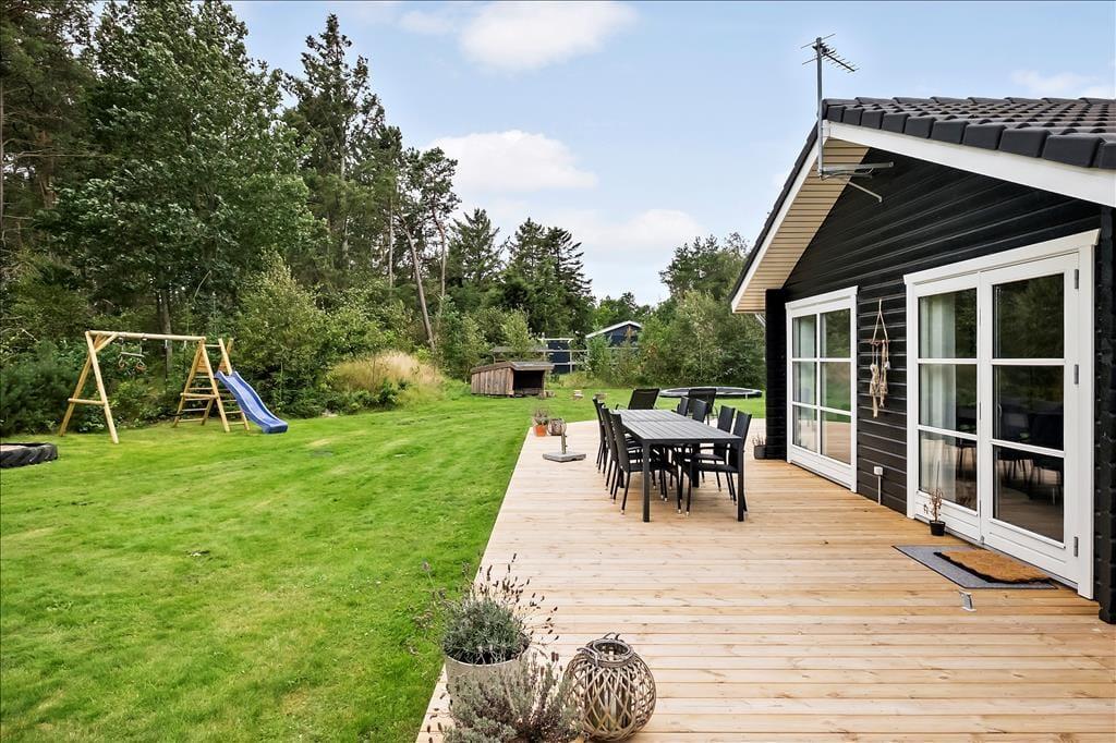 Huset ligger på en fredelig naturgrund med god plads til leg og udendørshygge på alle tider af året. På den store terrasse er der indbudt til grill og familiehygge. Her kan I sidde og nyde et glas vin i aftensolens sidste stråler, mens børnene leger i trygge omgiveler omkring huset.