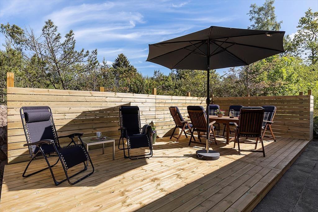 Mod syd ligger en overdækket terrasse, der hurtigt kan blive den foretrukne opholdsplads på lune dage og lyse sommeraftener. Vil I hellere sidde helt ude under åben himmel, kan I finde en solkrog på flisebelægningen, der breder sig rundt om huset – hvis ikke I bare slænger jer på græsset på den 1100 m2 store grund, hvor I er omgivet af høje løvtræer og anden naturskøn bevoksning.