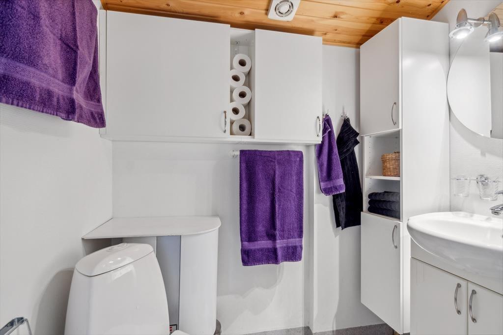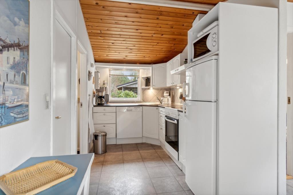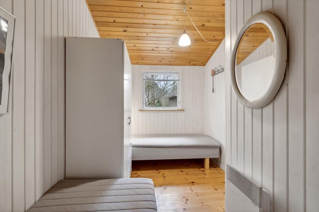 Sommerhuset byder på en lys og indbydende atmosfære, hvor den åbne planløsning skaber et rummeligt opholdsmiljø. Indretningen er både funktionel og hyggelig, og med store vinduer er der masser af naturligt lys, der fylder rummene med varme og liv. Stuen og køkkenet smelter sammen til et dejligt samlingspunkt, hvor du kan nyde fællesskabet – hvad enten du er i gang med at tilberede en lækker middag eller bare slapper af med en god bog ved brændeovnen. Her er der plads til både afslapning og samvær, og den lyse indretning gør det let at føle sig hjemme.